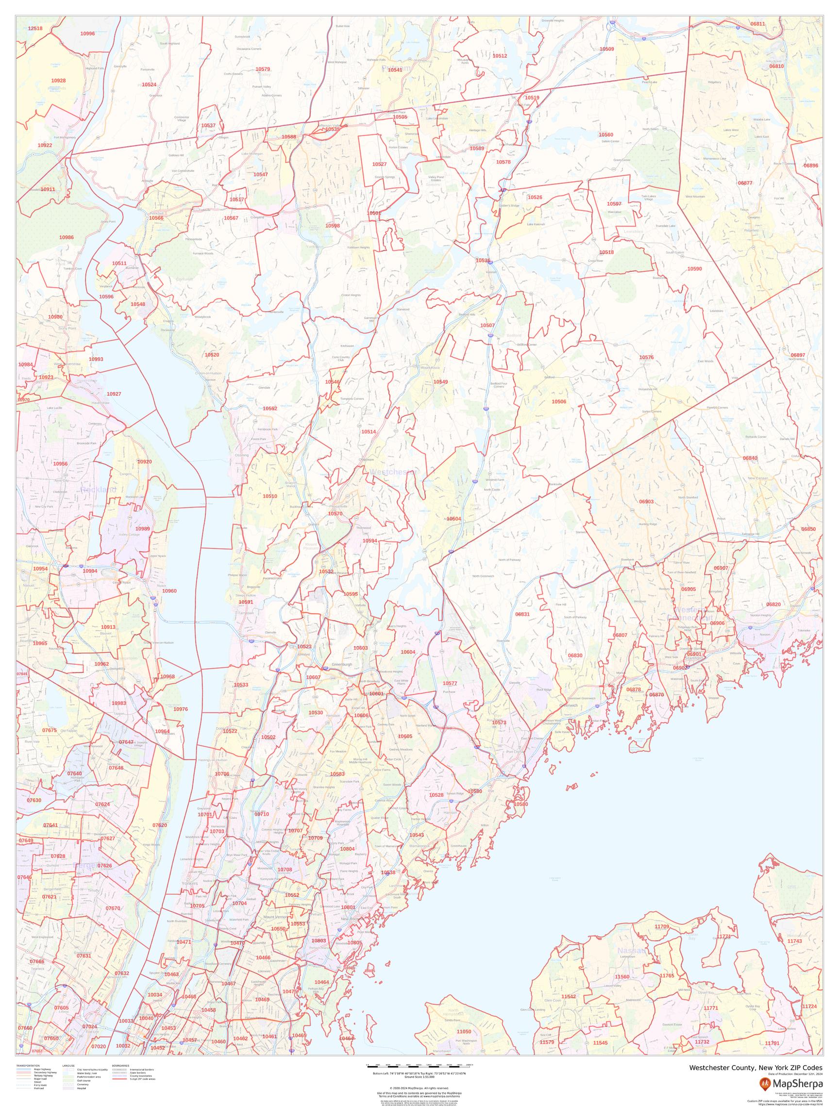 This map of Westchester County, New York shows ZIP code areas overlaid on a road map. Ideal for planning of deliveries, home services, sales territories, real estate and much more. Base map features include all roads with major roads and highways labelled; neighborhood names; railways; and high level land use such as parks and recreation areas, industrial areas and hospital campuses.