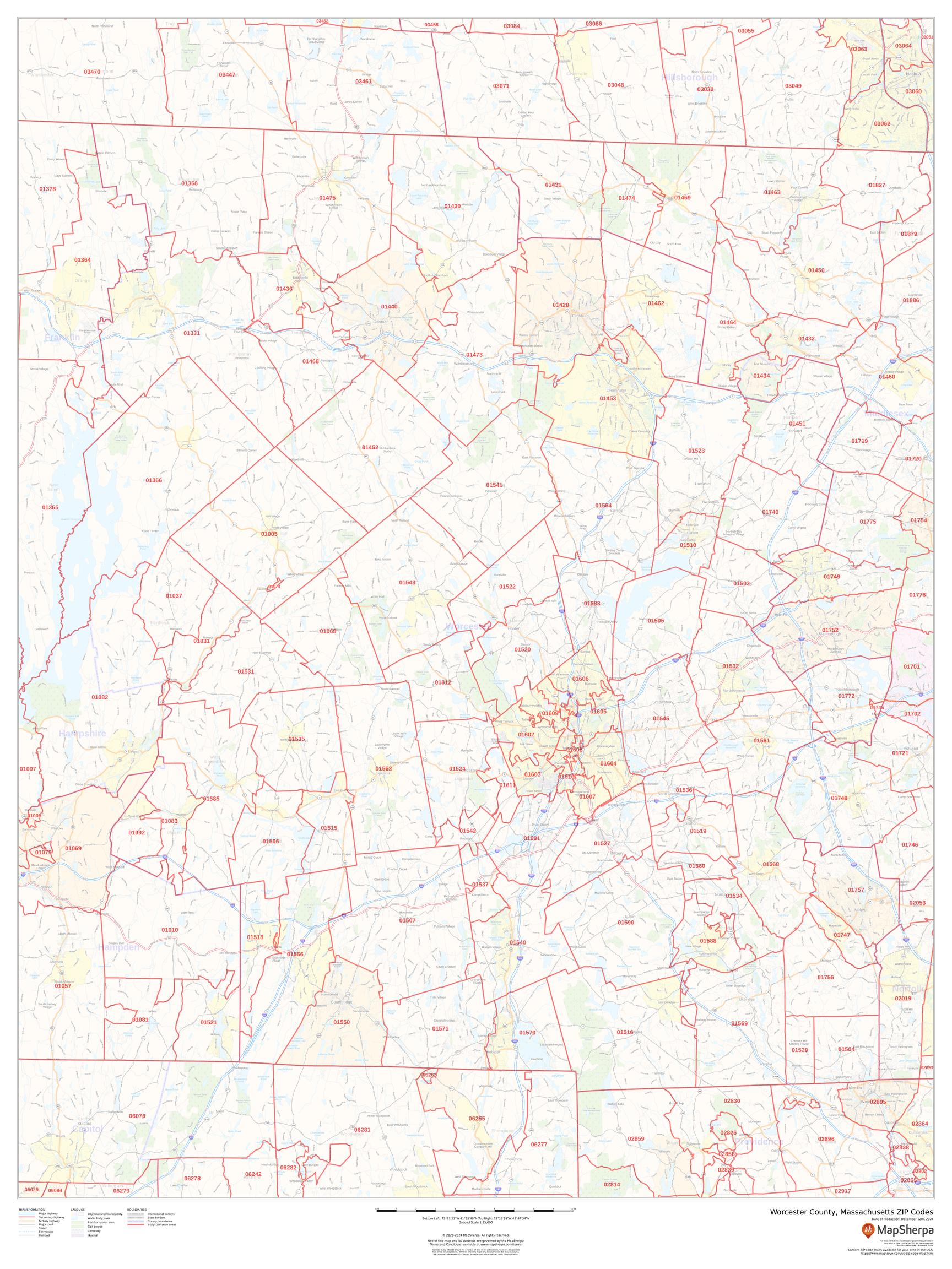 This map of Worcester County, Massachusetts shows ZIP code areas overlaid on a road map. Ideal for planning of deliveries, home ervices, sales territories, real estate and much more. Base map features include all roads with major roads and highways labelled; neighborhood names; railways; and high level land use such as parks and recreation areas, industrial areas and hospital campuses.