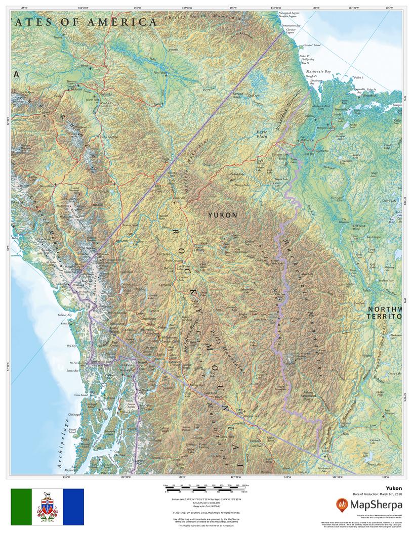 This beautiful map shows physical and political features for the Yukon surrounding areas. Relief shading and the use of different colours by height above sea level are both informative and attractive.
