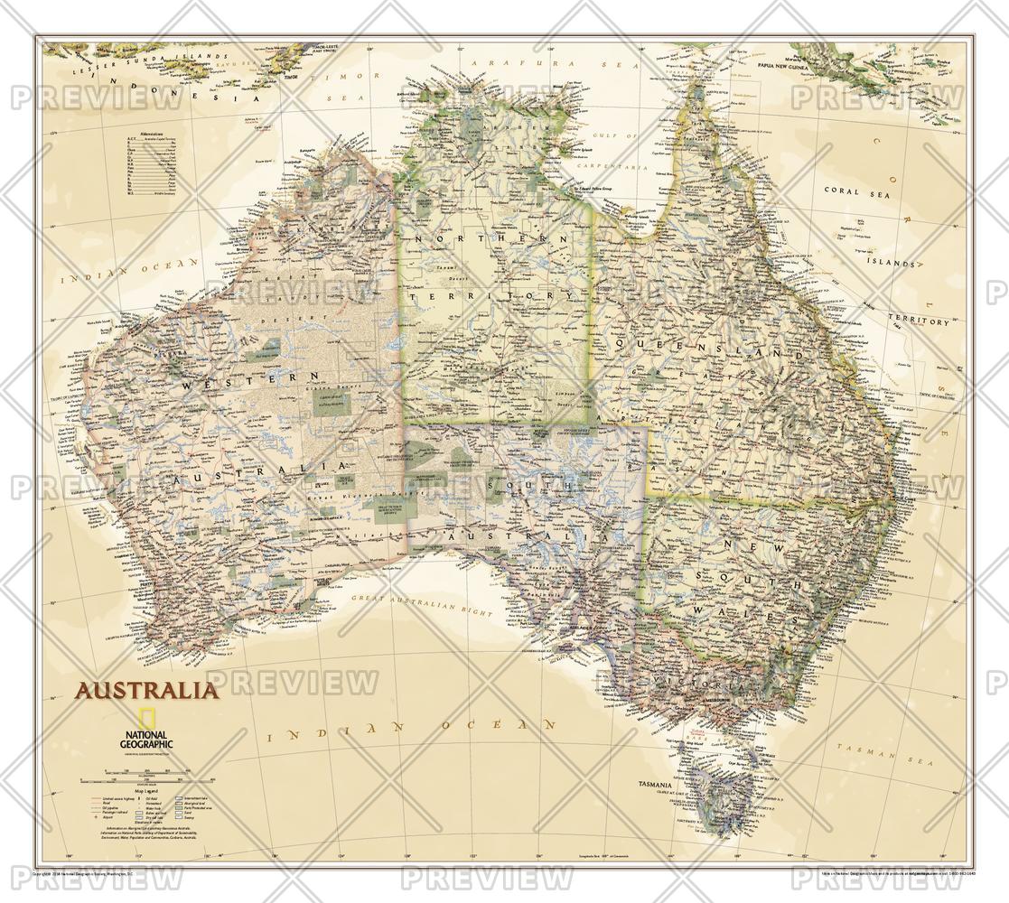Highly accurate Australia executive style political map clearly shows state boundaries, place names, bodies of water, parks and preserves, and more. Includes inset maps for Tasmania and major Australian cities.