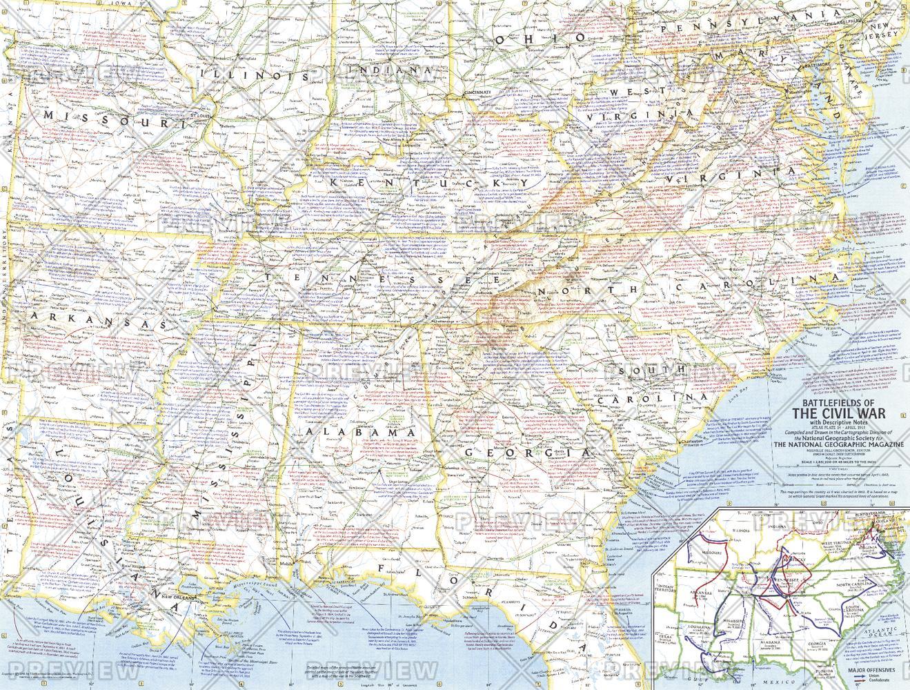 This Civil War map, based on a map upon which General Grant marked his proposed lines of operation, portrays the United States as it was charted in 1863. Published in April 1961 to accompany a map of Civil War battlefields, and the article "The Civil War."