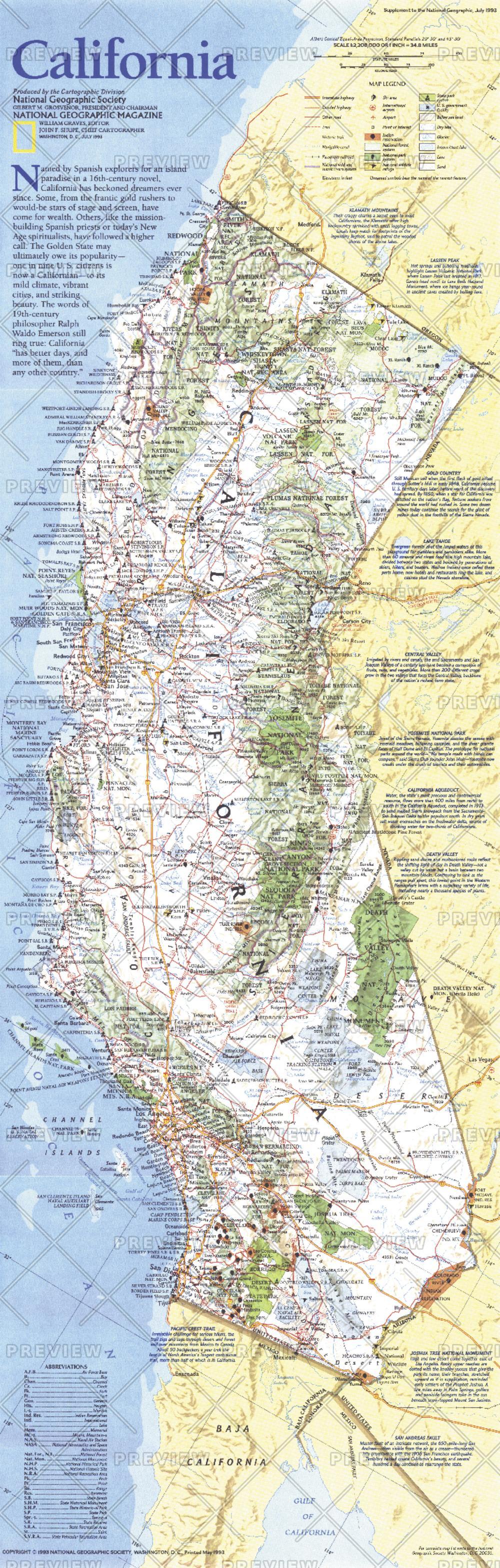 This map of California highlights an abundance of parks, forests, beaches, wildlife refuges, ski areas, and more. Notes on such areas as Lake Tahoe, Yosemite, the Gold Country, and Death Valley provide additional information about the spectacular sites to be found in this diverse and exciting state. Published in July 1993.