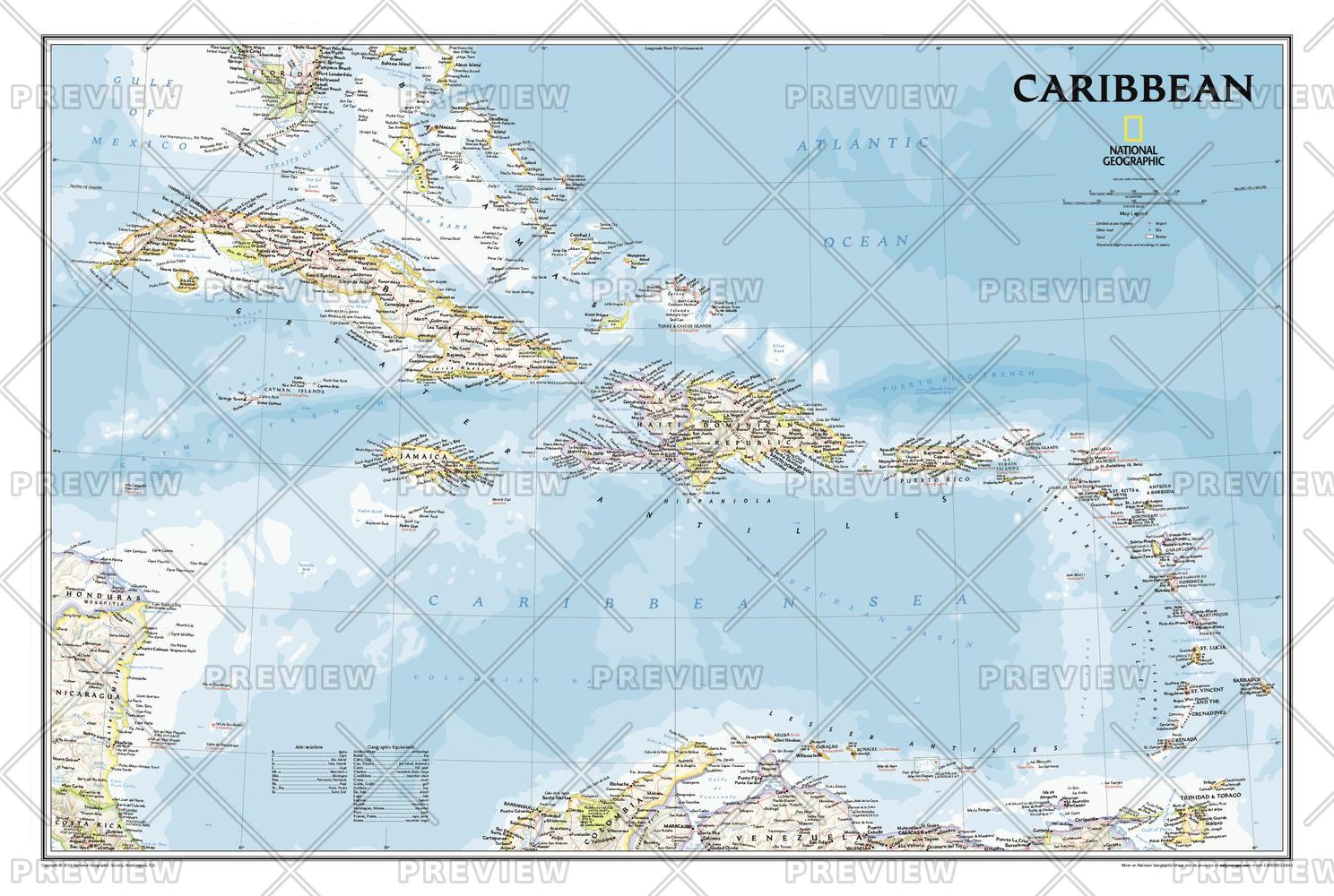 One of the most authoritative maps for the islands of the Caribbean Sea.<br><br>It shows the entire region in great detail, with coverage extending from the tip of Florida to the northern extents of Colombia and Venezuela, east to Barbados, and west to the eastern edge of Honduras, Costa Rica, and Nicaragua. Updated bathymetry reveals the remarkable seafloor variation of the Caribbean including the Puerto Rico Trench, the deepest point in the Atlantic Ocean at 8,605 meters (28,232 feet).<br><br>Includes over 1,000 named places including country capitals, primary and secondary towns; political boundaries, important infrastructure, and all key landforms. Useful and informative notes about the region's history and unique geography are spread throughout the map, providing the reader further understanding of the Caribbean's unique attributes.