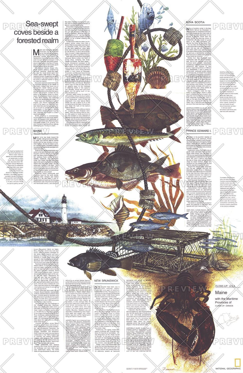 The "Maine, with Maritime Provinces of Close-up: Canada: Sea-swept Coves Beside a Forested Realm" travel poster is half of a two-map set published in March 1975. A companion to the "Maine, with Maritime Provinces of Close-Up: Canada" map, this poster contains a wealth of information on the sites of interest, travel tips, and tourist activities to be enjoyed in this unique region.
