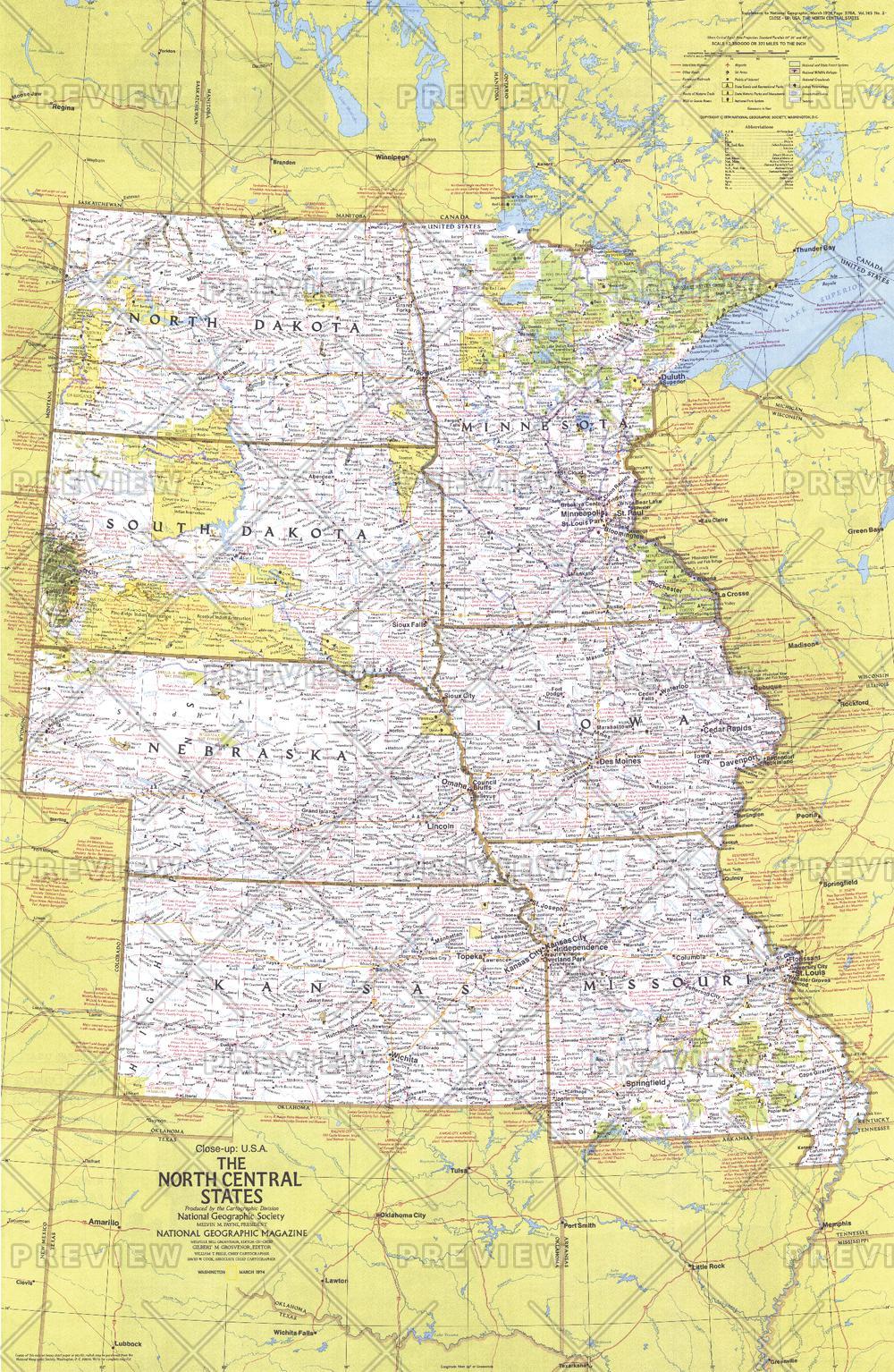 This map of the North Central United States lets you explore the nation's heartland. Features a wealth of travel and tourism information, including national and state parks, festivals, events, and historic points of interest, as well as an abundance of historical notes. Published in March 1974 as part of the "Close-up: U.S.A." series, with the travel poster "North Dakota, South Dakota, Nebraska, Kansas, Minnesota, Iowa, Missouri: Open Skies and Rolling Land."