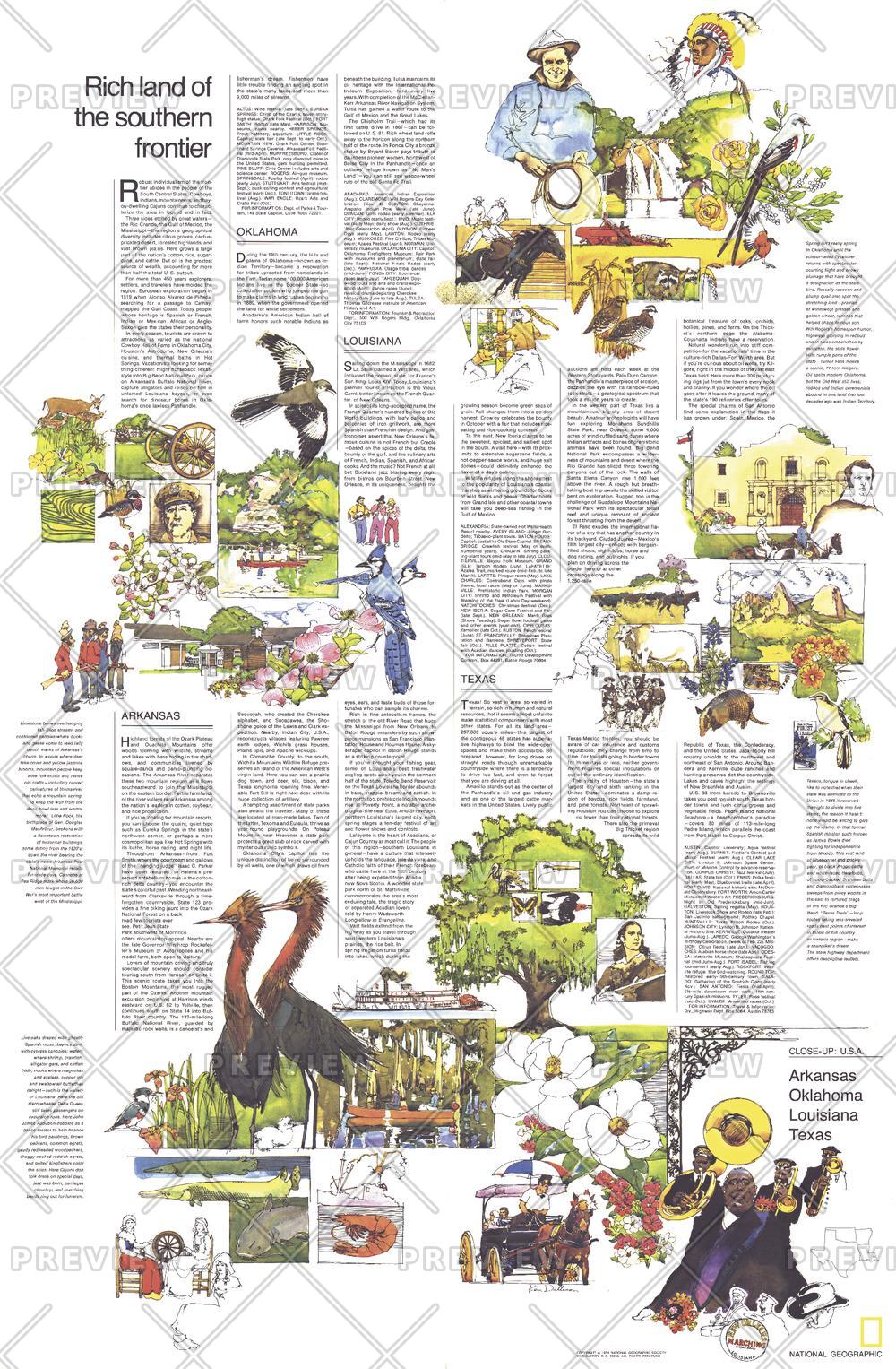Published in October 1974, this poster entitled "Arkansas, Oklahoma, Louisiana, Texas: Rich Land of the Southern Frontier" is half of a two-piece set in the "Close-Up: U.S.A." series, a companion to the South Central States map. With an overview of the beautiful and exciting vacations spots and sites to be seen in each of the four states, this work is a wonderful guide for travelers.