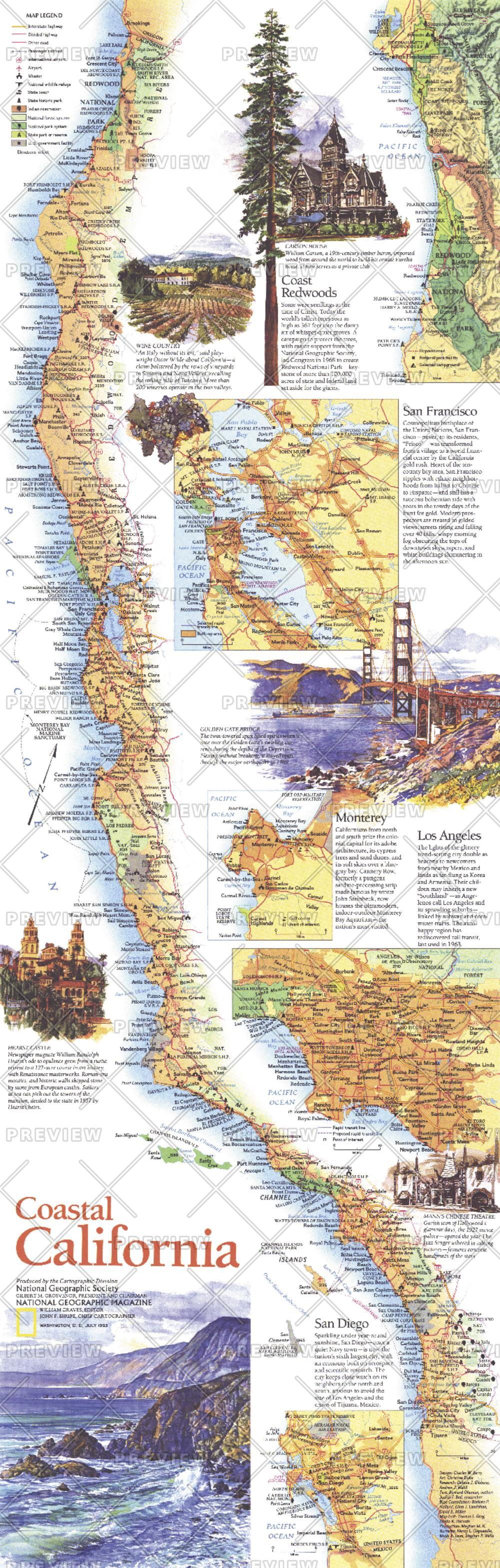 Published in July 1993 as half of a two-map set, this beautifully illustrated map of Coastal California highlights the sites and activities to be found along this extraordinary coastline. From the magnificent redwoods to the sunny beaches of San Diego, this map documents the diverse regions to be experienced along the coastline of the Golden State.