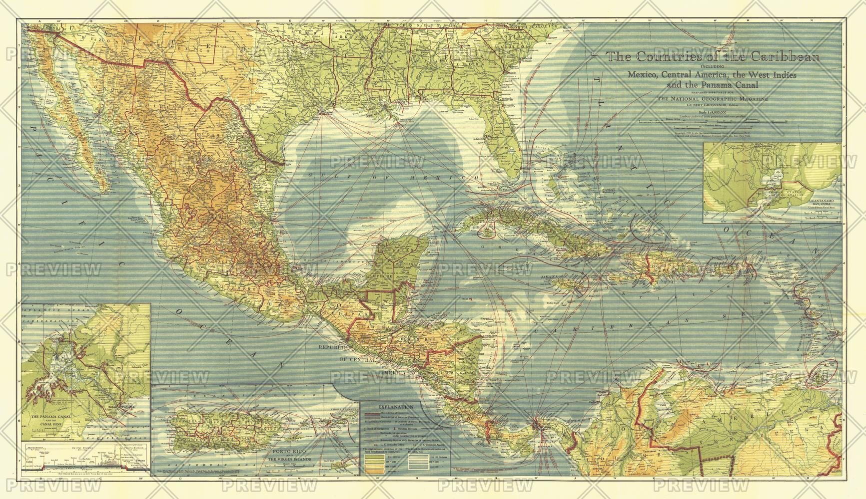 This beautiful map of the Caribbean includes Central America, the West Indies, and Mexico. Published in February 1922, this map appeared in an issue entirely devoted to Middle America. Rich color, and details such as inset maps, steamship routes, and wireless stations, make this piece a fine map for collectors.