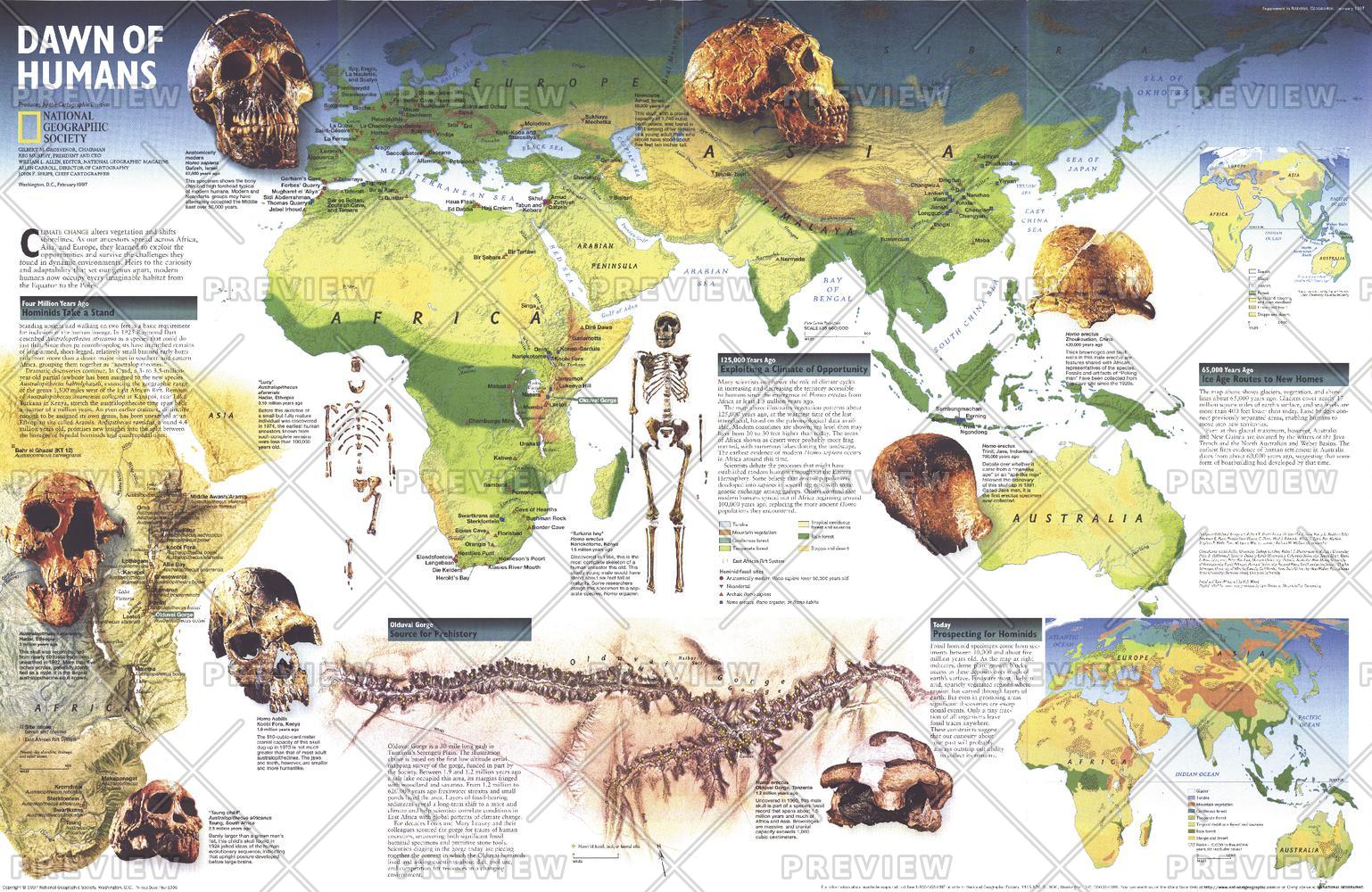 This fascinating map contains a wealth of information on our quest to discover the history of our prehistoric ancestors including fossil sites, information on significant hominid finds, and the challenges researchers face. Published in February 1997 with the "Seeking Our Origins" companion map, this work also includes maps which show the vegetation zones 125,000 years ago, 65,000 years ago, and today.