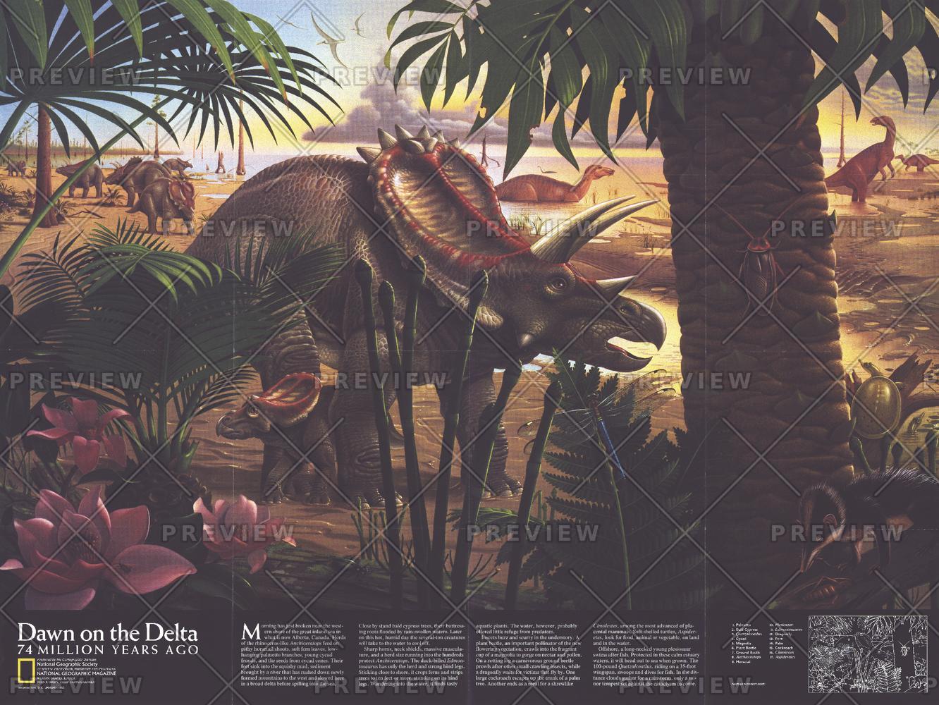 Published in January 1993, the "Dawn on the Delta: 74 Million Years Ago" poster is a stunning illustration of dinosaurs indiginous to North America. A companion to the "North America in the Age of the Dinosaurs" map, this beautiful depiction of an ancient landscape is a must-have for those fascinated by these enigmatic creatures.