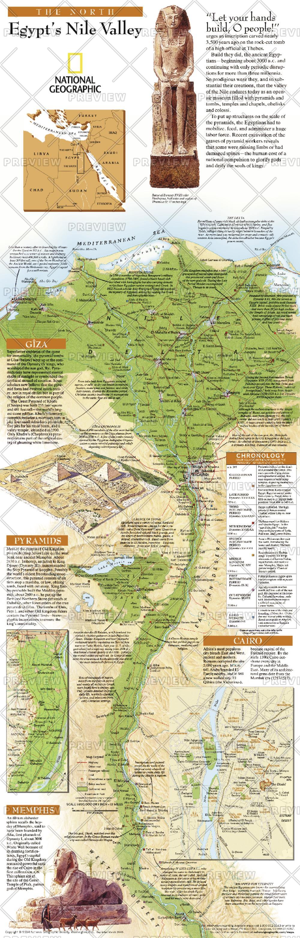Explore the wonder and mysteries of the northern Nile Valley with this educational map. A map of the rich Nile Valley and a guide through Egypt's magnificent past, this vibrant work features a chronological legend indicating the period best represented by each site. A must have for anyone interested in archaeology or history.