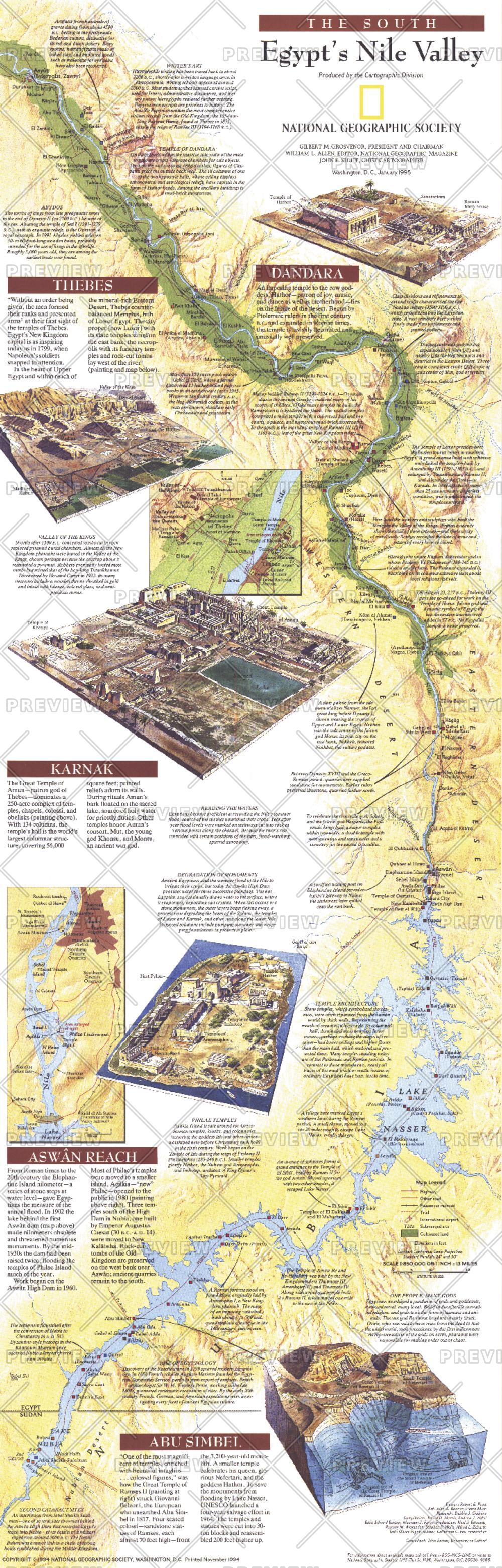 Explore the wonder and mysteries of the southern Nile Valley with this fascinating and educational map. Both a modern map and a guide through Egypt's magnificent past, this vibrant work features considerable details about archaeological sites and early Egyptian civilization. Published in January 1995, this map accompanied the "Egypt's Nile Valley North" map and the article "Age of the Pyramids: Egypt's Old Kingdom."