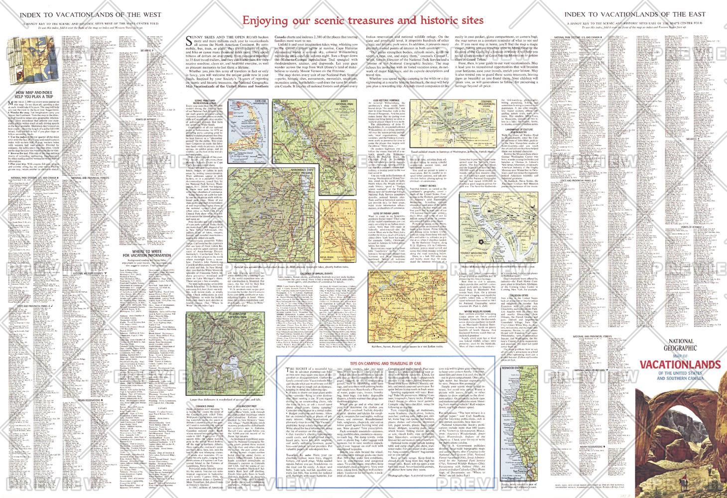 A supplement to the Vacationlands of the United States and Canada map, this map includes tips on vacationing and maps of some popular sites. Published in July 1966, it contains information on the variety of scenic and historical sites, from the lure of Indian lands and places where wildlife roam to landmarks of city and industry.