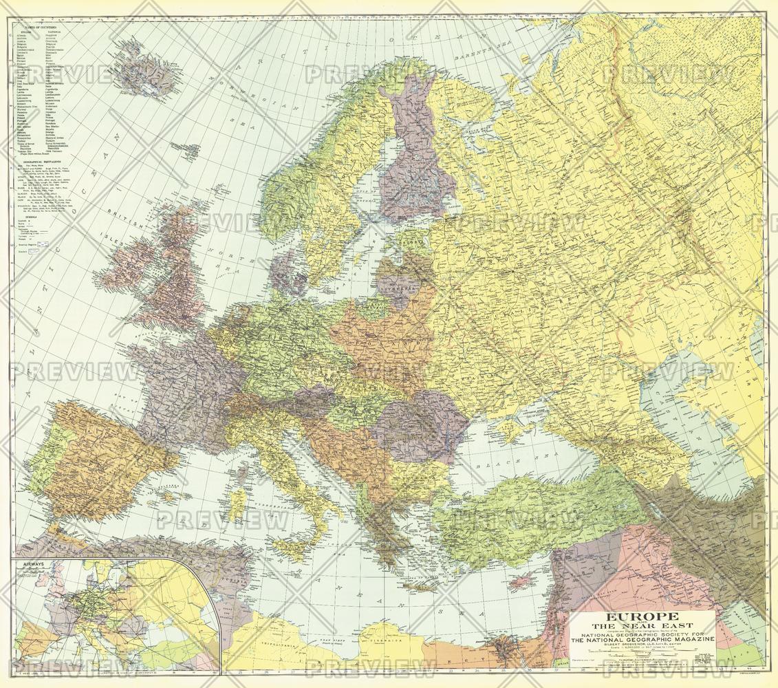 This colorful map was published in December 1929 with three articles on Europe and the Near East including "The Danube, Highway of Races." An inset map of airways is included, showing commercial air travel in its infancy.