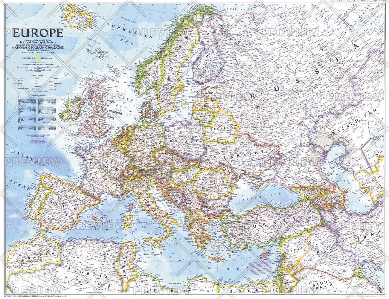 This striking map of Europe reveals a new landscape of nations as they emerged at the end of the Cold War. A wonderful snapshot of a historic period in Europe's history. Published in December 1992 as half of a two–map set with "The New Europe."