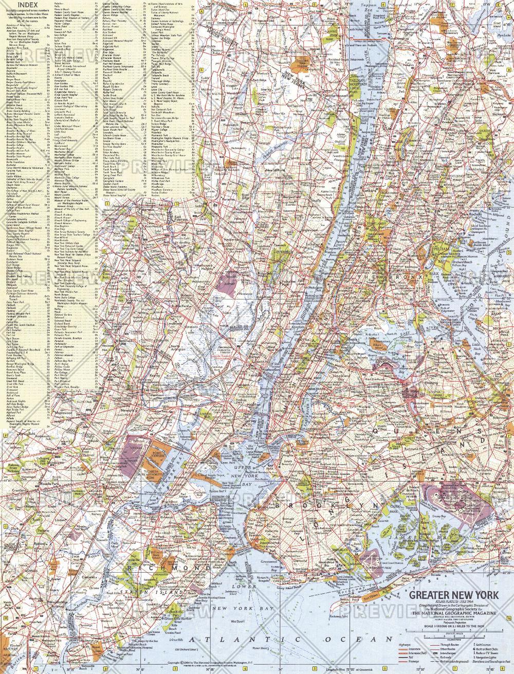 This map of Greater New York provides a detailed look at this extraordinary city. A complete index is included, making it easy to find the hundreds of points of interest the city has to offer. Published in July 1964 as part of a two–map set with "Tourist Manhattan."