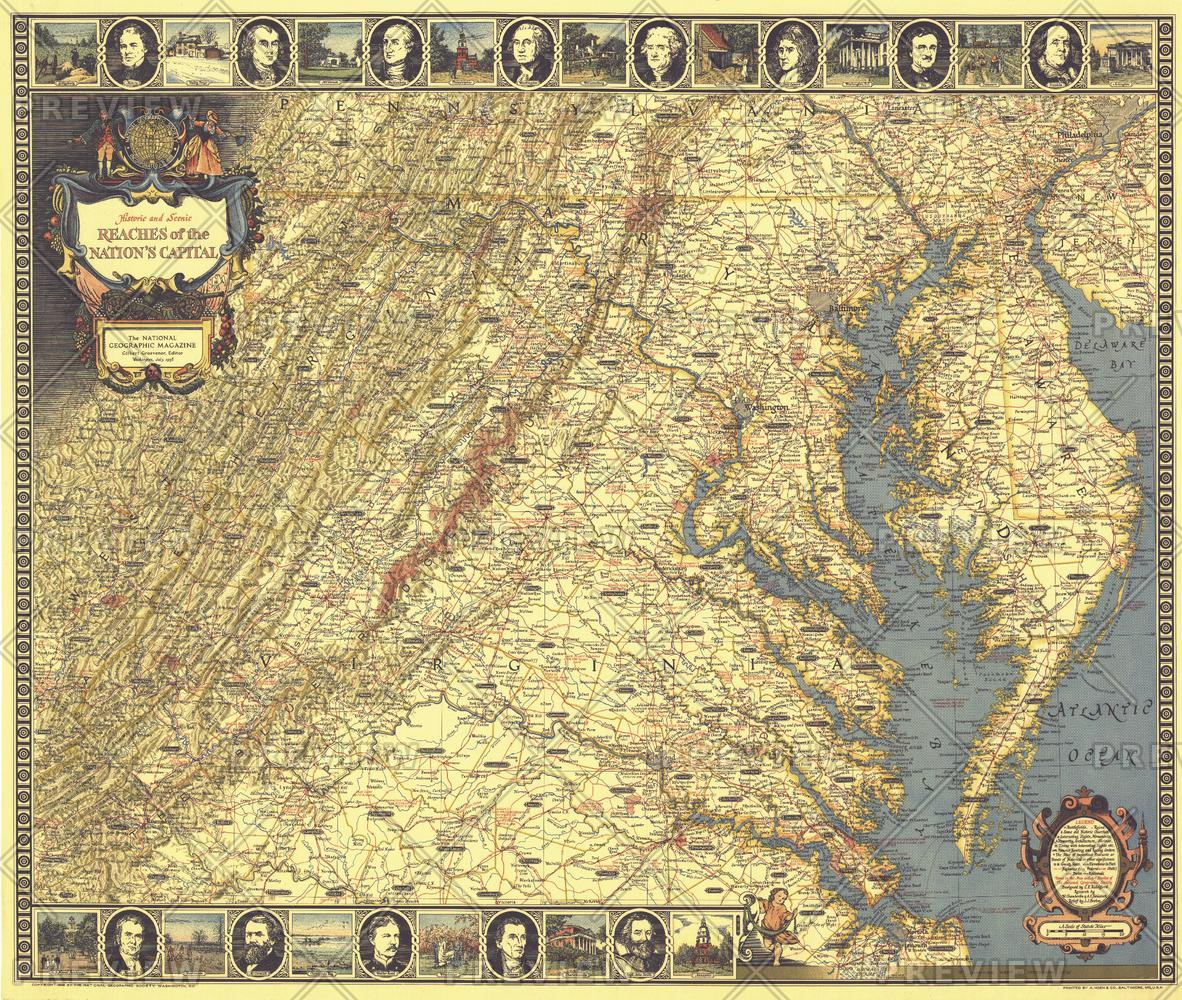 With its border of notable figures and places, this map of the Historic and Scenic Reaches of the Nation's Capital is as much a work of art as a map. Published in July 1938 with the article "Roads from Washington," it contains a variety of interesting historical sites and notes. A unique cartographic work and perfect for framing.