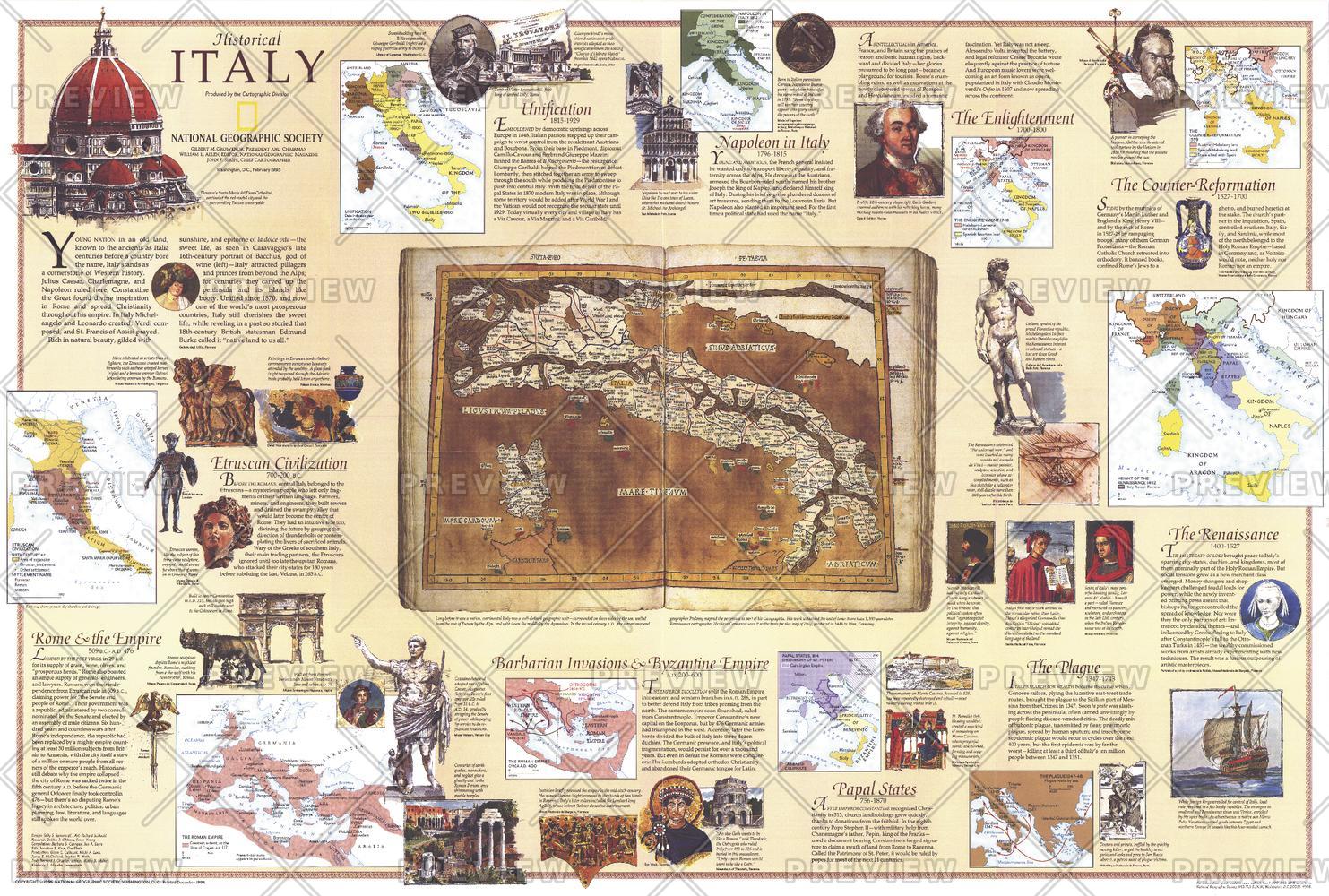 Half of a two-map set, this historical map of Italy appeared in the February 1995 issue of National Geographic with a stunning physical and political map of the country and an article on Venice. Filled with historical information and illustrations, this map boasts eleven inset maps detailing key periods.