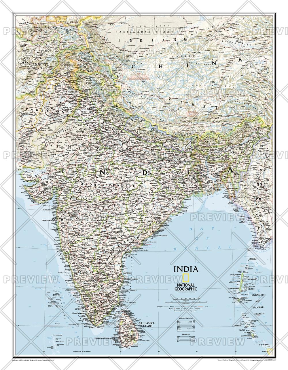 One of the most detailed and comprehensive maps ever published for India and southern Asia. It includes India, Sri Lanka, Nepal, Bangladesh, Bhutan, Tajikistan, and portions of China, Pakistan, Afghanistan, and Myanmar. The India map is punctuated with thousands of place names, and embellished with shaded relief which highlights the region's dramatic topography in such places as the Tibetan Plateau and the Himalaya.
