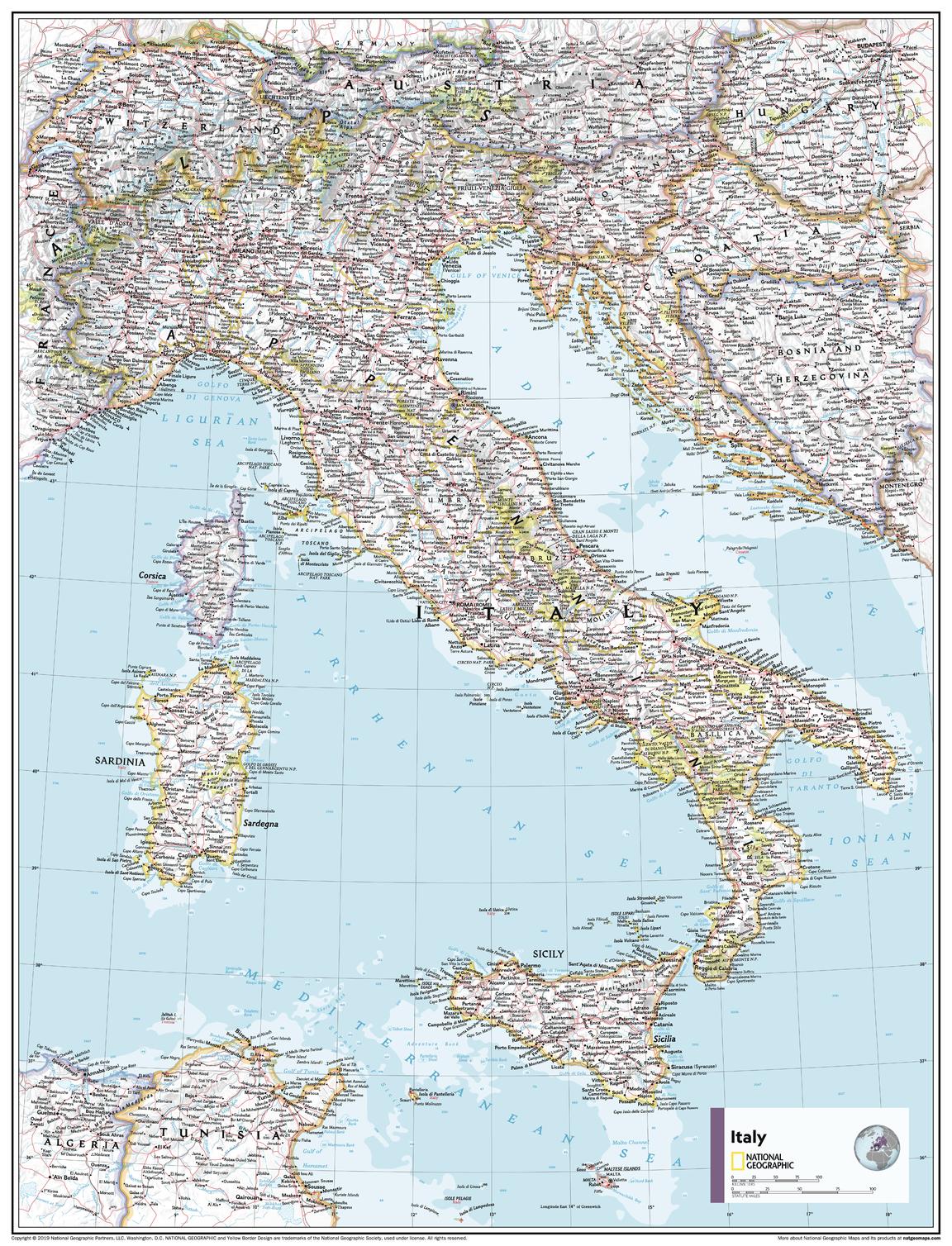 This Italy map of physical and political features can fit in any space. Showcasing the countries in stunning detail with state-of-the-art cartographic techniques delivering accuracy and exceptional quality, the innovative and engaging design makes the content easily accessible and user-friendly.