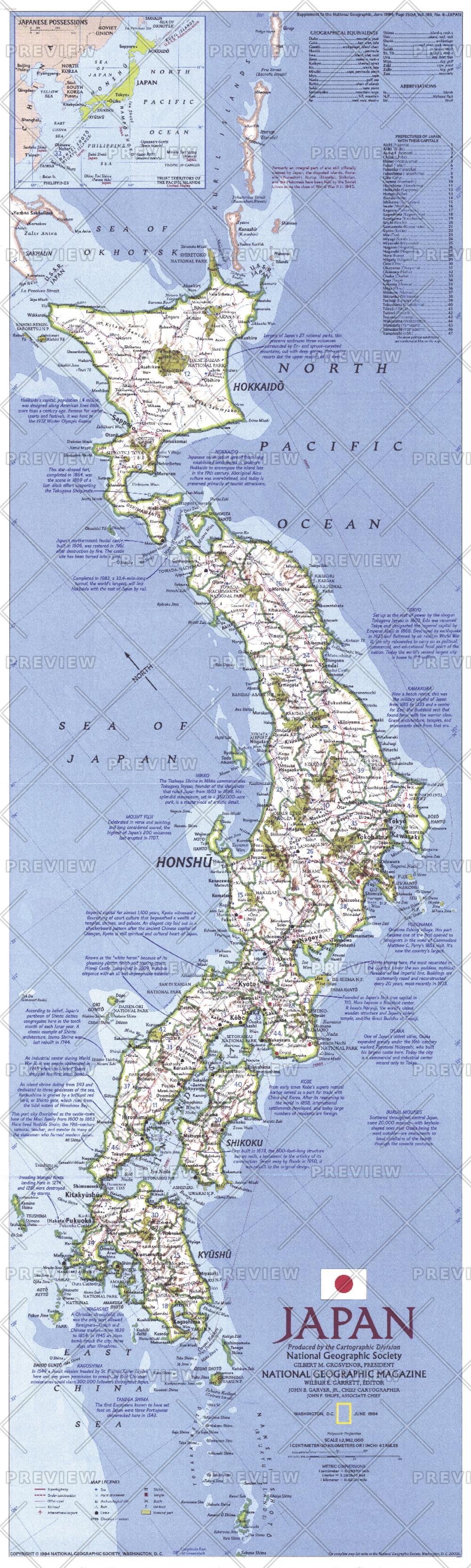 This map of Japan is vibrant and striking in its detail, containing an abundance of historical notes and landmarks. Published in June 1984 as a companion to a historical Japan map and the article "Hagi: Where Japan's Revolution Began."