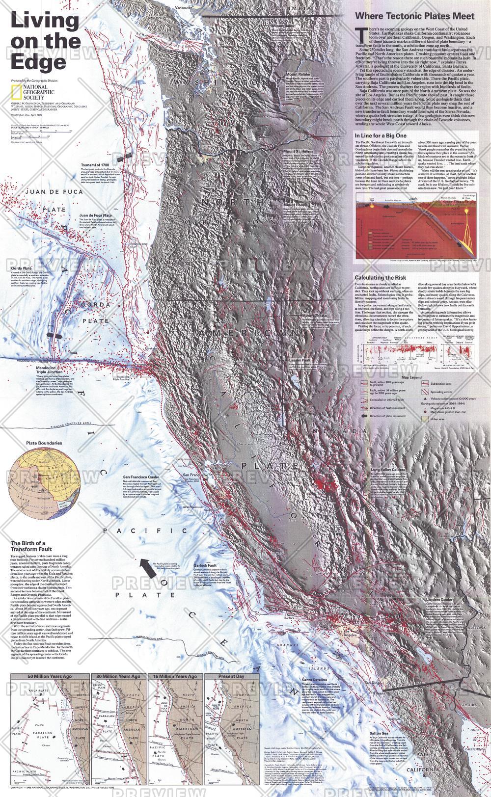 There is no escaping geology on the West Coast of the United States. Earthquakes continually shake California, while volcanoes loom over northern California, Oregon, and Washington. Each of these hazards marks a different kind of tectonic plate boundary - transform faults to the south, subduction zones up north. This map shows the western United States along with all of its known major fault lines and zones.