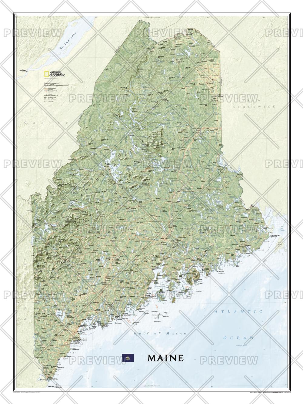 Maine State Wall Map, part of National Geographic's growing series of State Wall Maps. Map depicts Maine's diverse terrain and vegetation and ocean bathymetry. Contains hundreds of place names and precise locations of cities, major roadways and railways, airports, federal and state protected lands, mountain ranges and prominent peaks, marine sanctuaries, military installations, major lakes, rivers and reservoirs, and other geographic features.