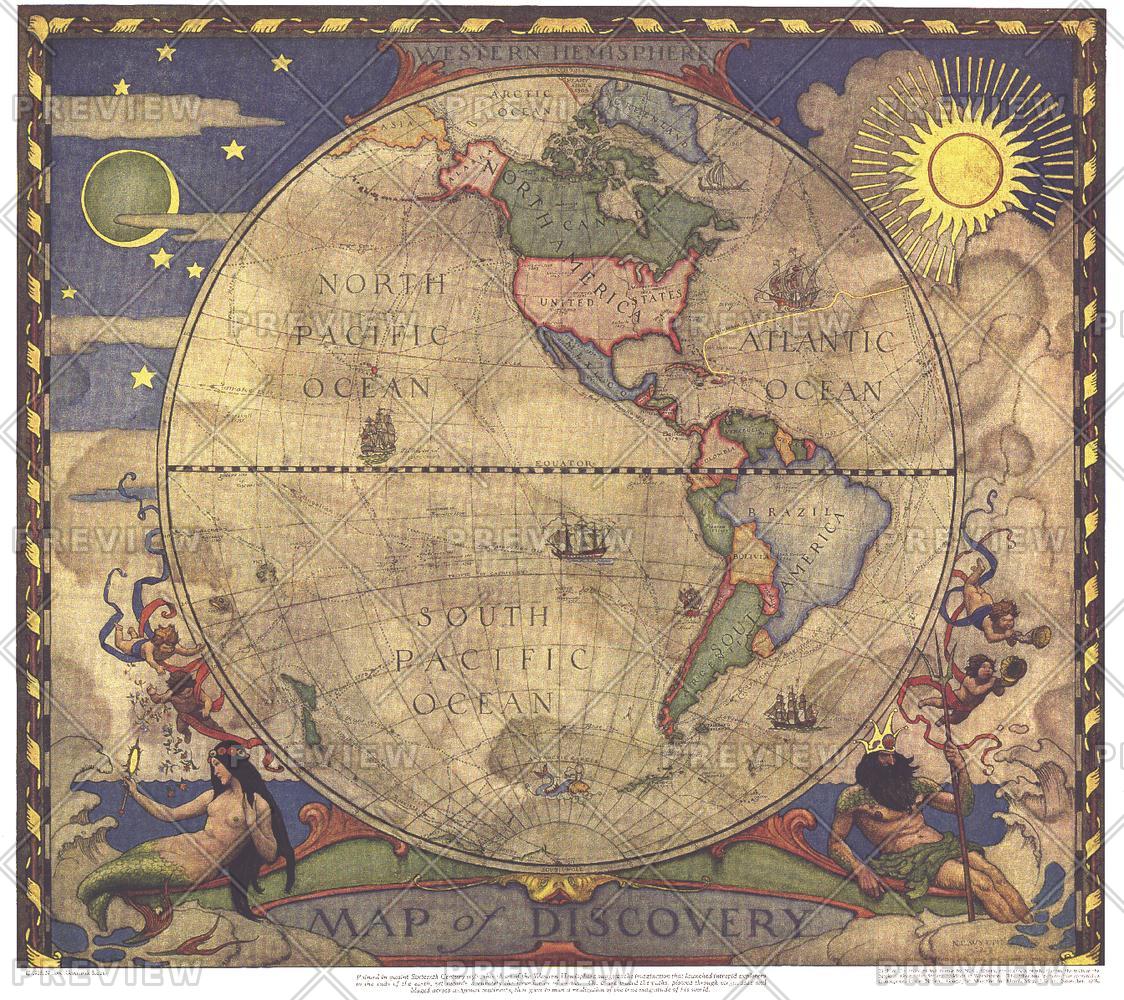 In 1927, famed American painter N. C. Wyeth completed a series of five murals for Hubbard Memorial Hall, the National Geographic Society's first formal library. The Map of Discovery: Western Hemisphere, published in January 1929, is one of those outstanding murals. It features Poseidon and a mermaid keeping watch over the oceans as well as the routes of explorers and dates of expeditions.