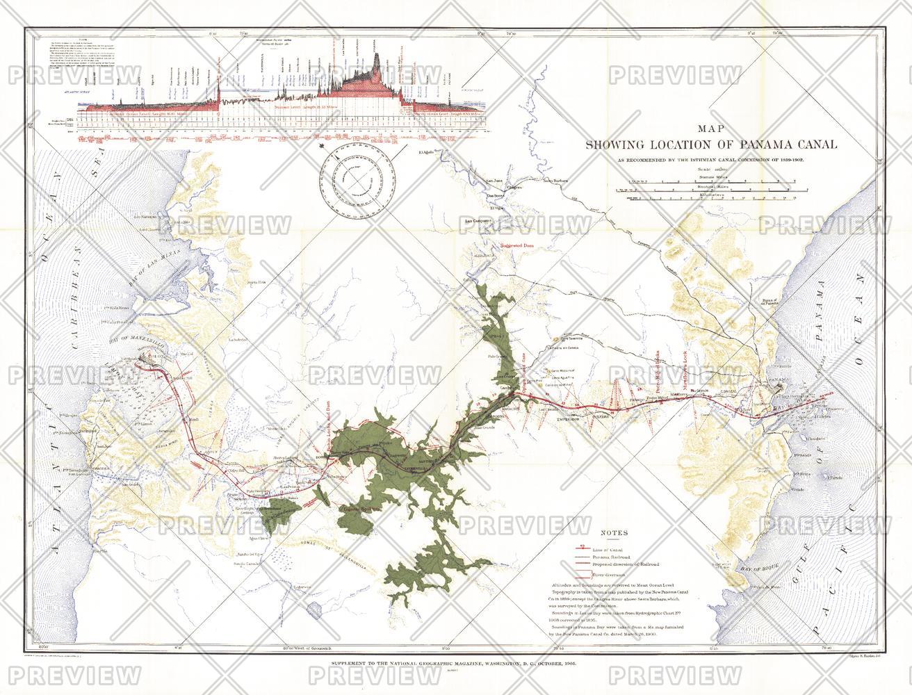 The "Map Showing Location of Panama Canal, as Recommended by the Isthmian Canal Commission of 1899-1902" is a unique historical piece published in October 1905 with three articles on canals. One of the largest engineering projects ever undertaken, the famed canal linking the Atlantic and Pacific oceans was completed in 1914. This map makes a fine companion for the "Birds-eye View of the Panama Canal" map printed in 1912.