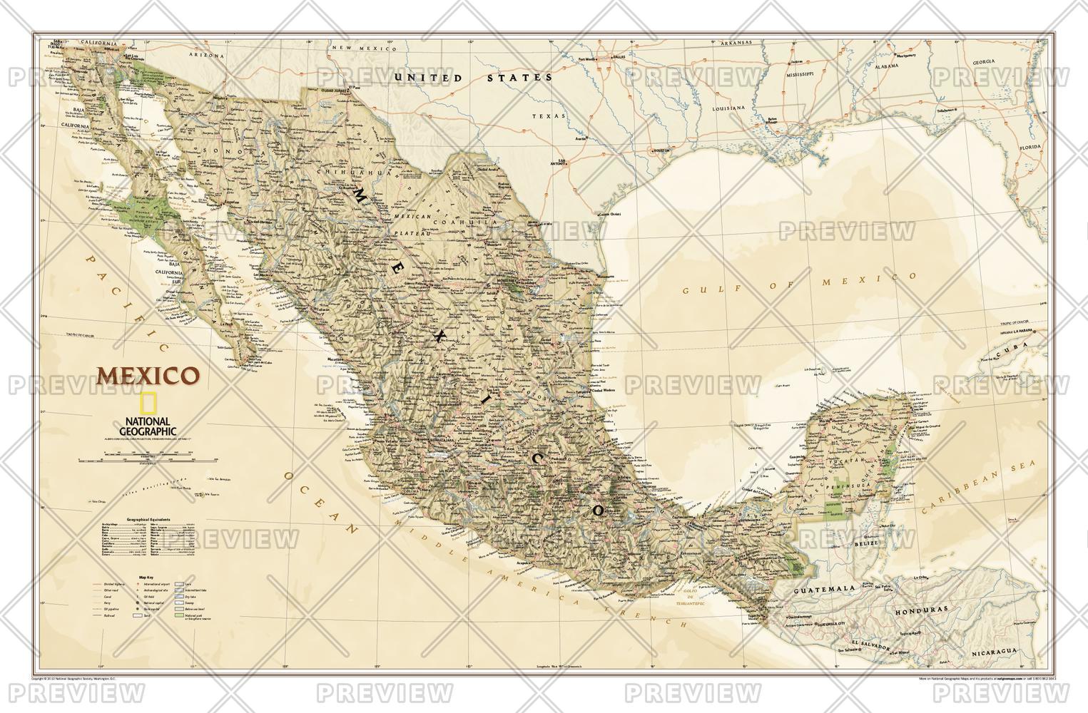 Our most detailed wall map of Mexico, updated with National Geographic's rich, antique-inspired Executive styling. Features thousands of place names, accurate political boundaries, national parks including Cumbres de Monterrey National Park, biosphere reserves including El Vizcaino Biosphere Reserve, archeological sites including the ruins of the Yucatán Peninsula, and major infrastructure networks such as roads, canals, ferry routes, and railroads. Mexico's diverse terrain is detailed through accurate shaded relief, coastal bathymetry, and symbolism for water features and other land forms. Elevations of major peaks are expressed in both feet and meters, depth soundings are expressed in fathoms.