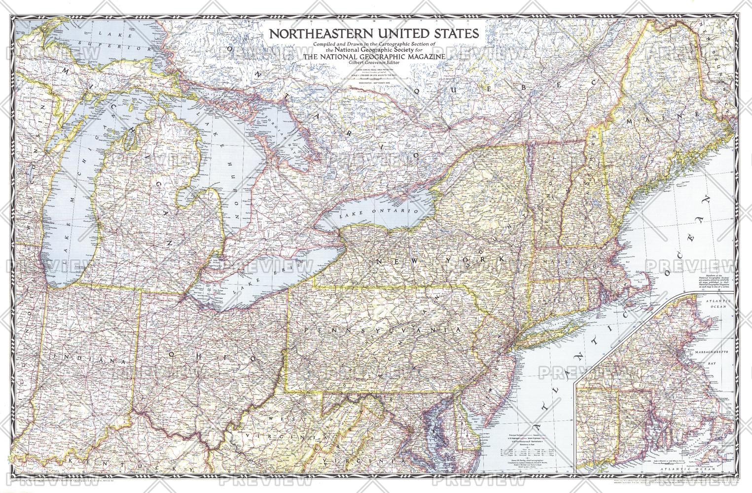 This detailed and attractive map of the northeastern United States, published in September 1945, was the first of the region that National Geographic published. State boundaries are clearly and colorfully marked, and a distinctive border frames the map in a style indicative of National Geographic's signature presentation.