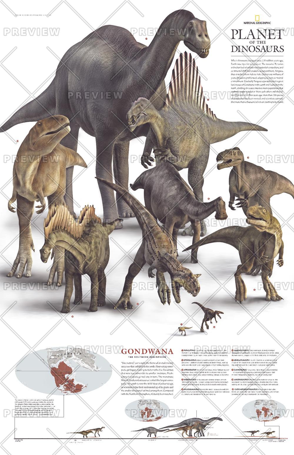 More than 550 species of dinosaurs have been named, and scientists estimate that more than a thousand others are waiting to be found. When the supercontient Pangaea separated into two great landmasses, Gondwana in the south and Laurasia in the north, dinosaur populations were divided into two main populations that evolved mostly in isolation from each other until they met their end 65 million years ago. This remarkable poster was published in December 2007 as half of a two-piece set. It features ten of the dinosaurs that roamed Gondwana in the southern hemisphere.