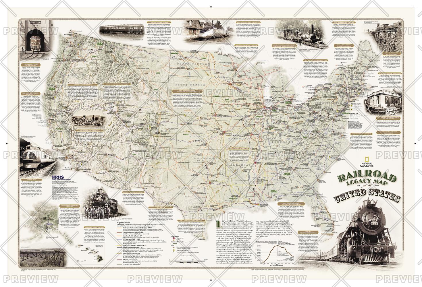 National Geographic's new Railroad Legacy Map of the United States illustrates the many ways railroads have impacted the nation and shaped people's daily lives. From the creation of time zones still used today to the contributions to the country's economic and industrial development, America's railroad legacy is interwoven with the growth of the United States in the 19th and 20th centuries and of the century to come.<br><br>The map portrays the routes of today's seven Class 1 (major) railroads, Amtrak's passenger routes, as well as those of the more than one hundred Class 1 railroads that ran in 1920 when five percent of the nation's work force—more than 2 million people—were employed by these lines. The map also highlights present-day and 1920 rail hubs along with text and illustrations of key events in America's railroad history such as the opening of New York City's Grand Central Terminal in 1913 and the last Class I line to employ steam locomotives in 1960. Notable sites such as tunnels, train spotting locations, and railroad museums are also included on this map.<br><br>The map is measures 24"x36" — suitable for framing.