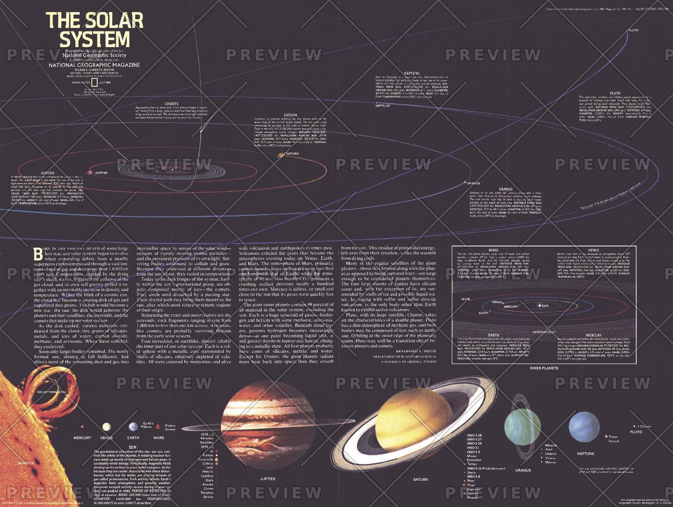 Published in July 1981 with a map of Saturn and the article "Voyager 1 at Saturn: Riddles of the Rings," this stunning illustration of the solar system contains information about the sun and the planets, as well as an extensive introduction about the formation of the solar system.