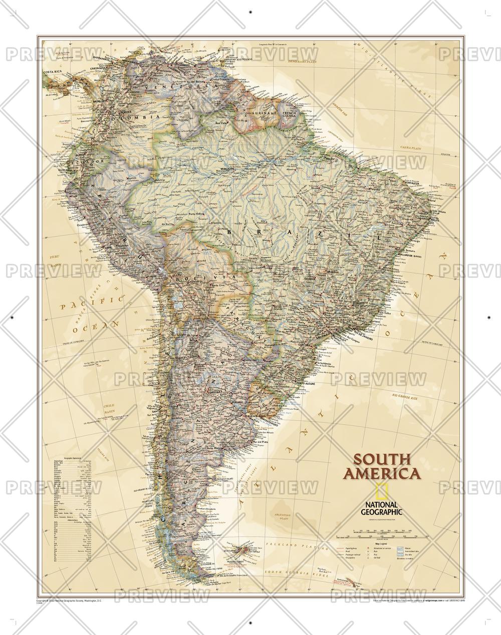 This elegant, richly colored antique-style map features the incredible cartographic detail that is the trademark of National Geographic quality. This map of South America shows political boundaries, place names, airports, major roads and highways, and other geographic features for the entire continent.