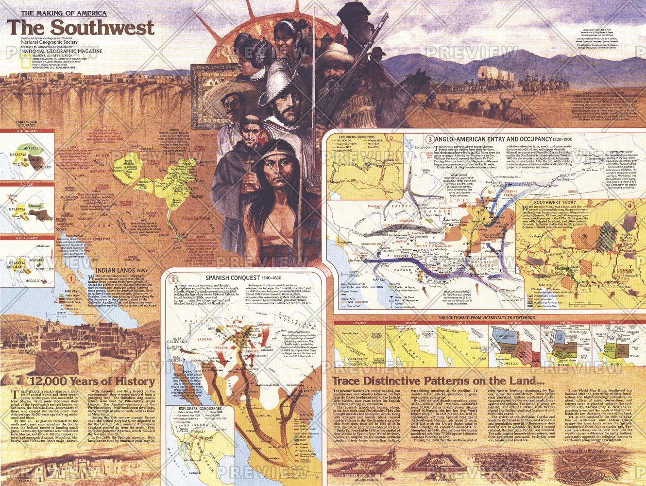 Part of the "Making of America" series, this map of the Southwest represents Side Two in a two-map set. Published in November 1982, its focus is on the enchanting states of Arizona and New Mexico and the surrounding region. Multiple maps illustrate the fluctuations of the region's occupants and their imprint on the land. This map accompanied four articles on the Southwest including "The Anasazi - Riddles in the Ruins."