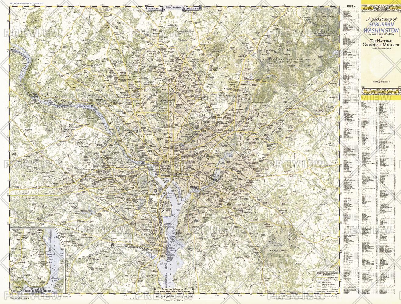 A Pocket Map of Suburban Washington, D.C., Maryland and Virgina is half of a two-map set published in September 1948 with the article "American Masters in the National Gallery." Detailed and indexed, this map also contains an inset of the Potomac River south to Mount Vernon. Its companion map, "A Pocket Map of Central Washington, District of Columbia," appeared in the same issue.
