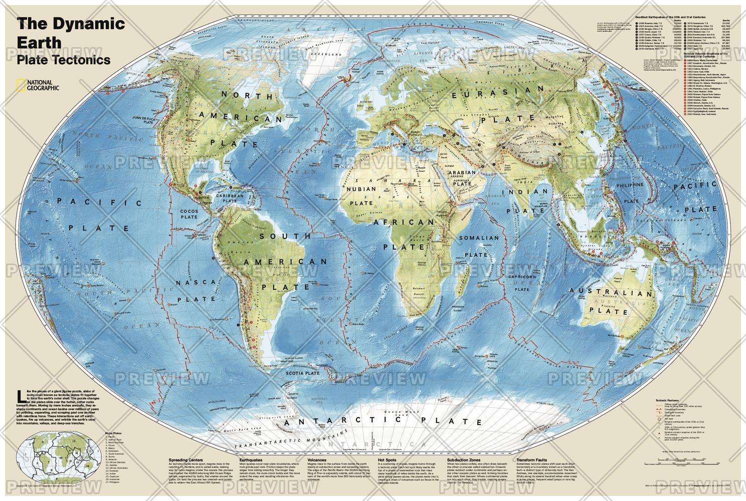 The Dynamic Earth wall map illustrates plate tectonics and features new bathymetry and naturally colored relief, as well as volcano and earthquake data through 2011.<br><br>Like pieces of a giant jigsaw puzzle, tectonic plates fit together to form the earth's outer shell. The interaction of these plates causes earthquakes and volcanoes and shapes the earth's crust into mountains, valleys and deep-sea trenches. The Dynamic Earth map illustrates 17 major tectonic plates and highlights diffuse plate boundaries, convergent boundaries, spreading boundaries, fault zones, hot spots, notable earthquakes and volcanic eruptions of the 20th and 21st centuries, earthquakes with a magnitude of greater than 6.5 during the 20th and early 21st centuries, and notable volcanic eruptions during the past 10,000 years.