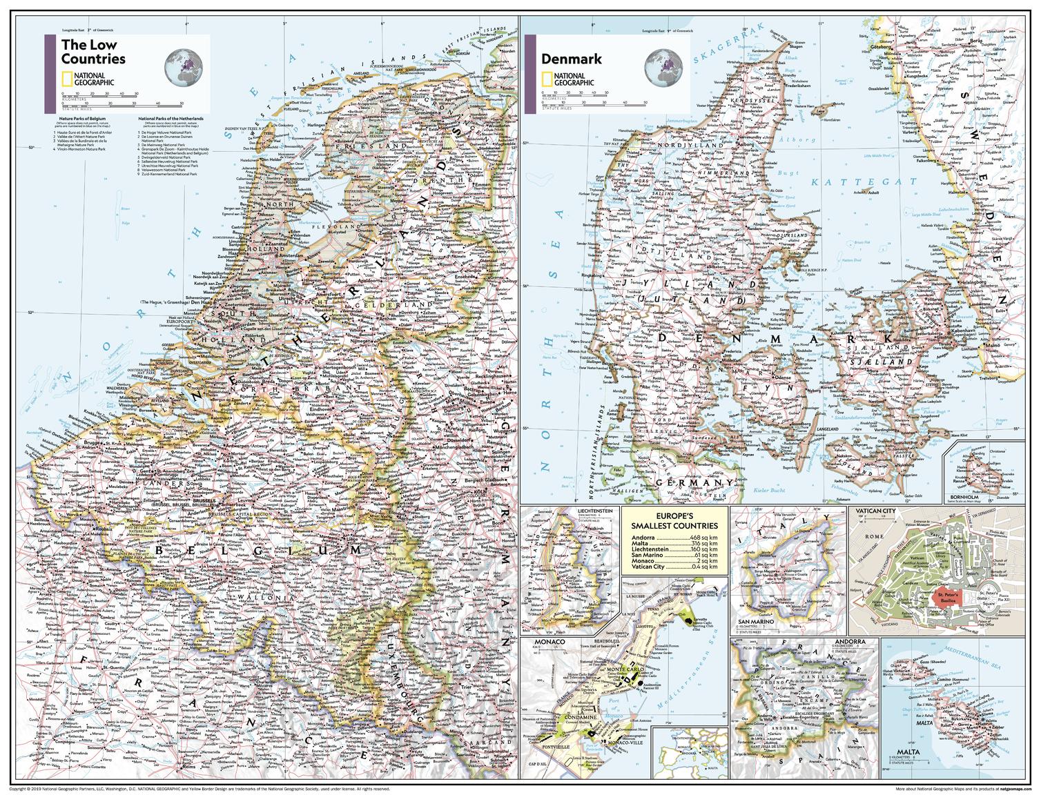 This Low Countries, Denmark and Europe's Smallest Countries map of physical and political features can fit in any space. Showcasing the countries in stunning detail with state-of-the-art cartographic techniques delivering accuracy and exceptional quality, the innovative and engaging design makes the content easily accessible and user-friendly.