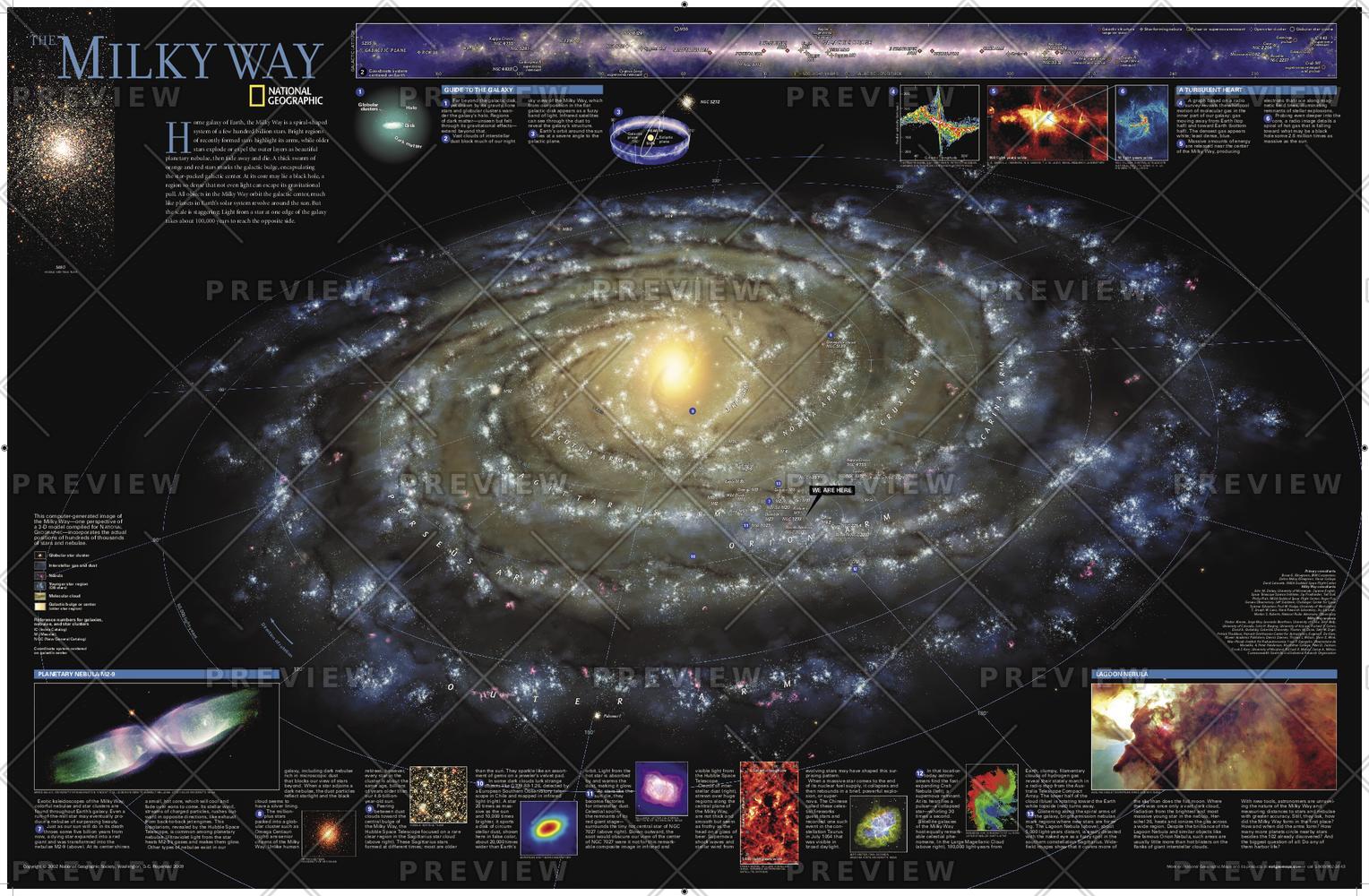 This computer-generated image of the Milky Way shows the entire galaxy in one perspective of a 3-D model compiled specially for National Geographic. The model incorporates the positions of hundreds of thousands of stars and nebulae within the galaxy, shows Earth's location, and includes additional photographs, descriptions and locations of fascinating phenomena throughout the Milky Way.