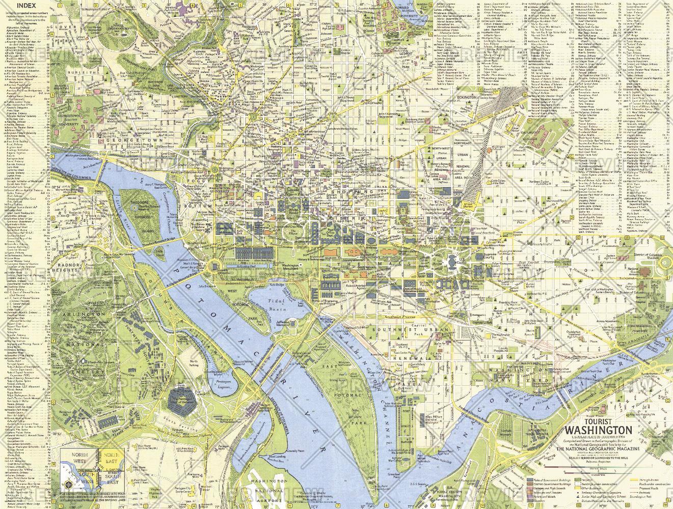 Explore the national capital of the United States. Published in December 1964, this map and its companion "Suburban Washington" make up the two-piece set that accompanied the article "Washington: The City Freedom Built."