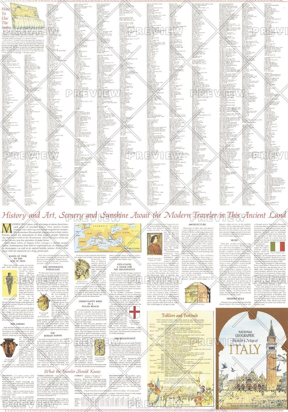 Published in June 1970, A Traveler's Map of Italy contains a wealth of information about the history of the country as well as helpful hints about clothing, currency, shopping, transportation, and more. Half of a two-map set, this map also includes a list of the seasonal festivals and events held in Italy each year.