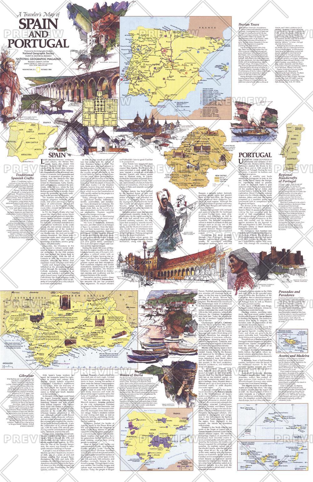 Published in October 1984, this half of the two-map set entitled A Traveler's Map of Spain and Portugal contains a wealth of information on the history and culture of the region. This map contains tour routes, a map of the Iberian wine country, information about the handicrafts of Spain and Portugal, and more.