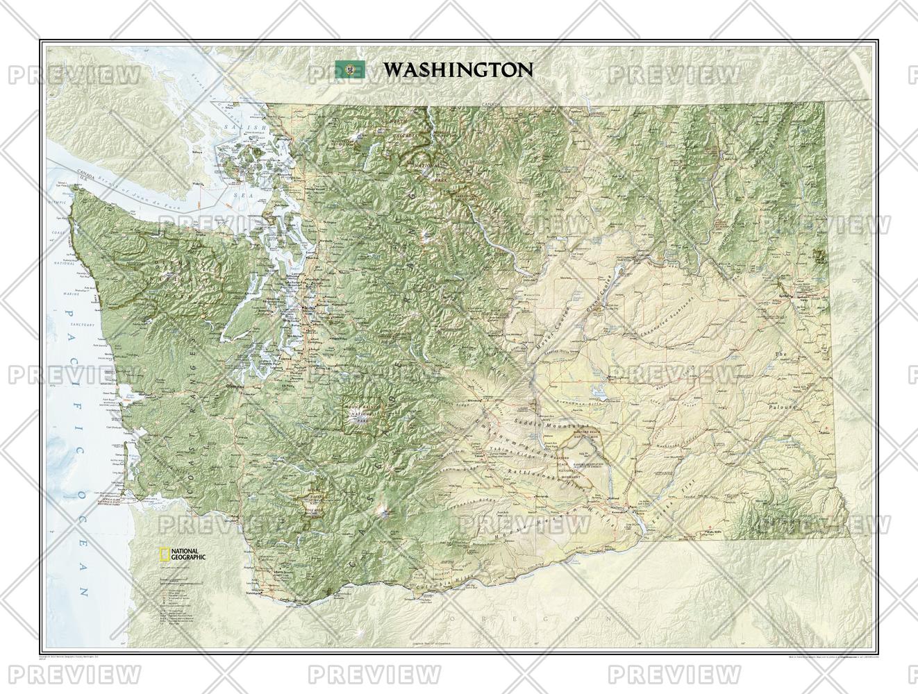 This map offers a dramatic visualization of Washington's physical geography. Land cover colorization distinguishes forests and deserts. Stunning shaded relief depicts mountains and ocean depths. The map locates and names cities, towns, islands airports, national and state parks, military bases, mountains (with peak elevations), lakes, rivers, and other natural features.