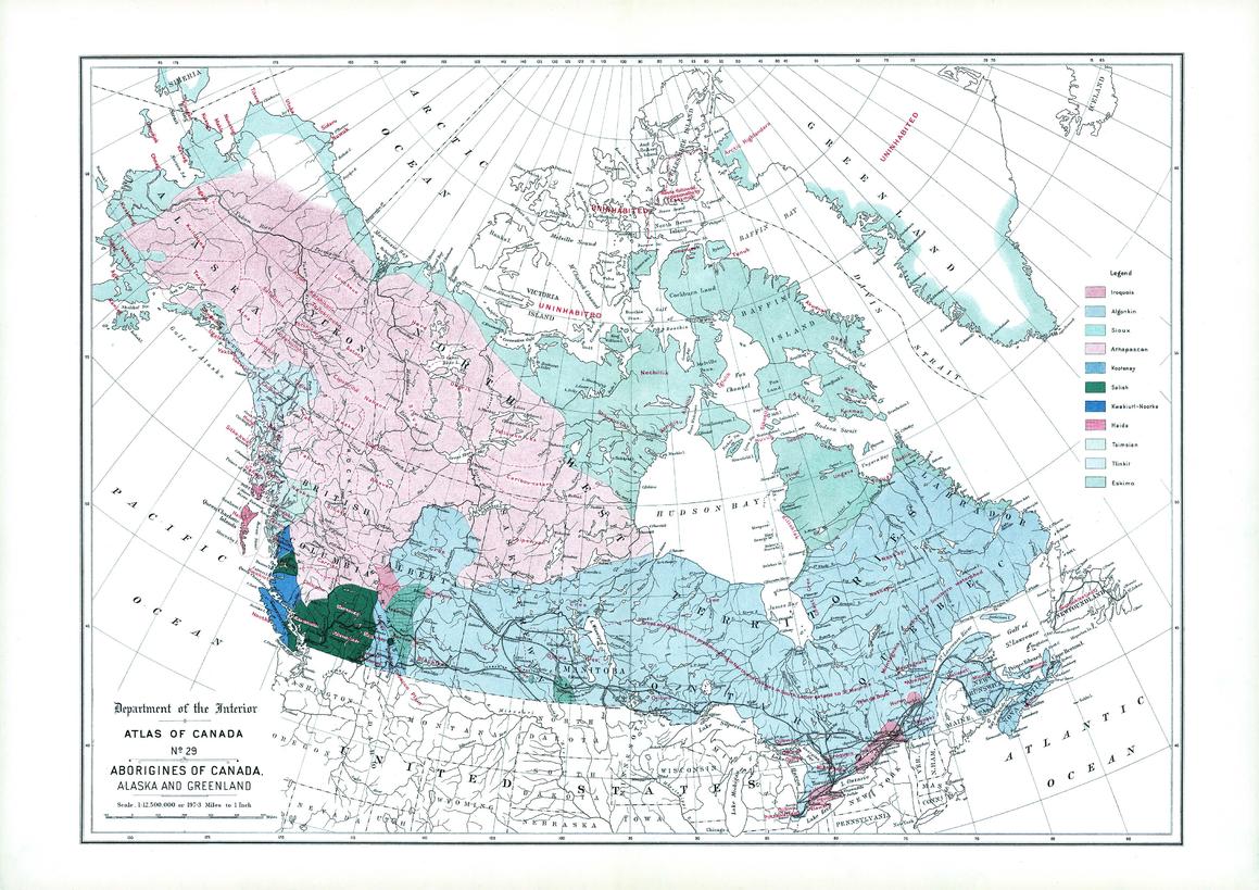 Contained within the 1st Edition (1906) of the Atlas of Canada is a map that shows the distribution of 11 aboriginal groups of Canada, Alaska and Greenland. The areas shown in different colours represent occupied land by the native linguistic families, including uninhabited large areas in the Arctic islands and Greenland. The southern portion of Canada, the Indians are living on reserves. The other points indicated are small reminants of the once powerful Huron-Iroquois at Jeune Lorette, two small bands of Iroquois near Edmonton and on the head waters of the Athabaska river. There are a greater number of linguistic families on the Pacific coast of British Columbia than in all the rest of Canada.