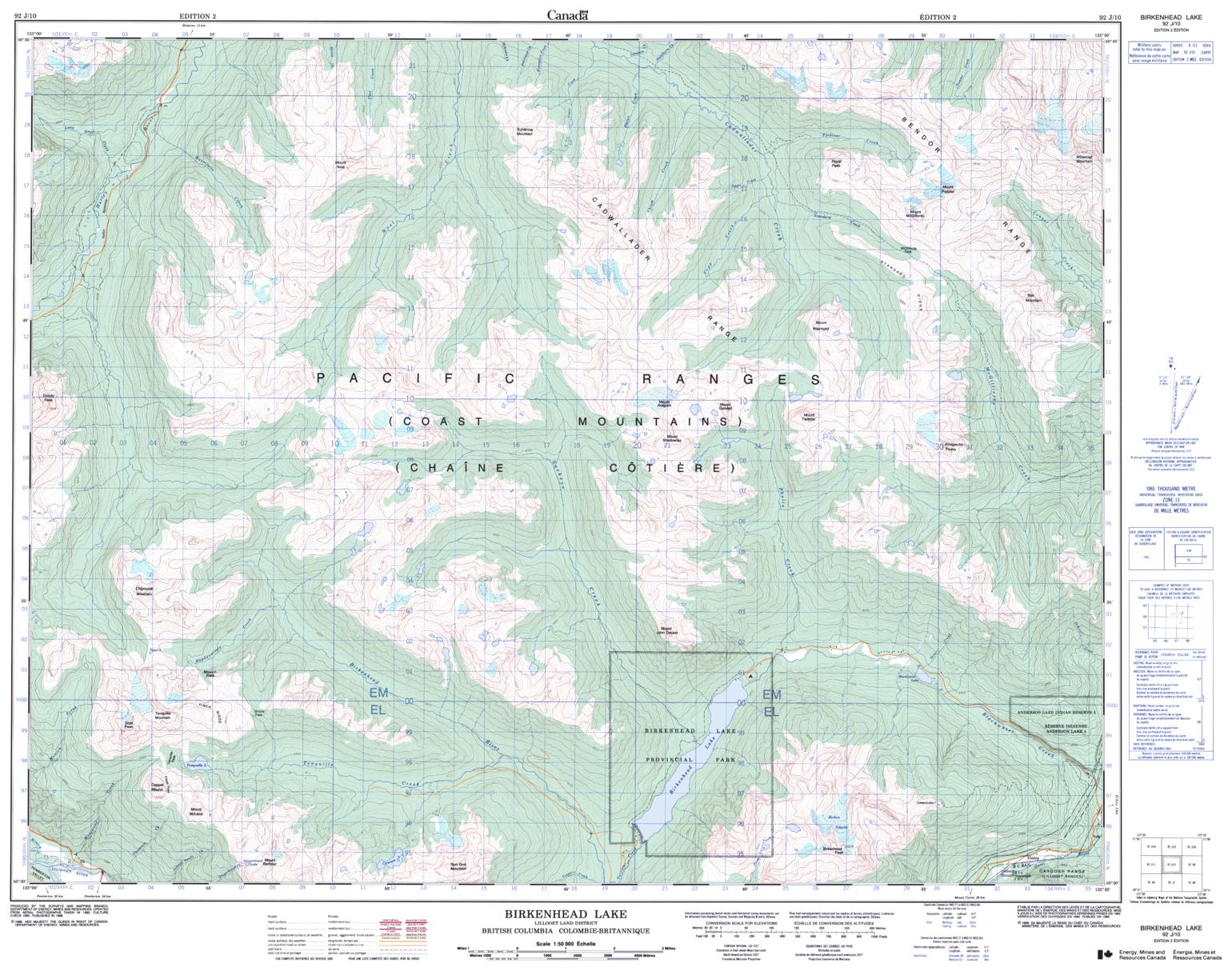 Canadian topographic map of Birkenhead Lake, British Columbia. NTS sheet 092J10 Edition 2.