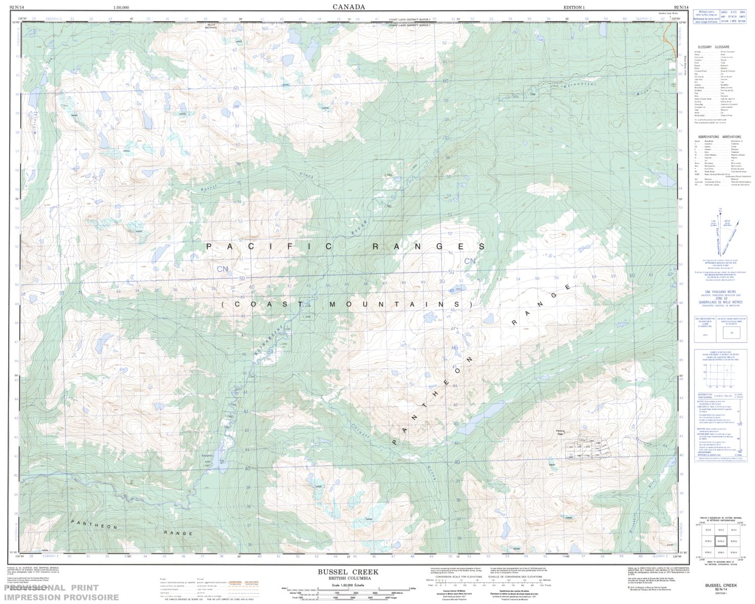 Canadian topographic map of Bussel Creek, British Columbia. NTS sheet 092N14 Edition 1.