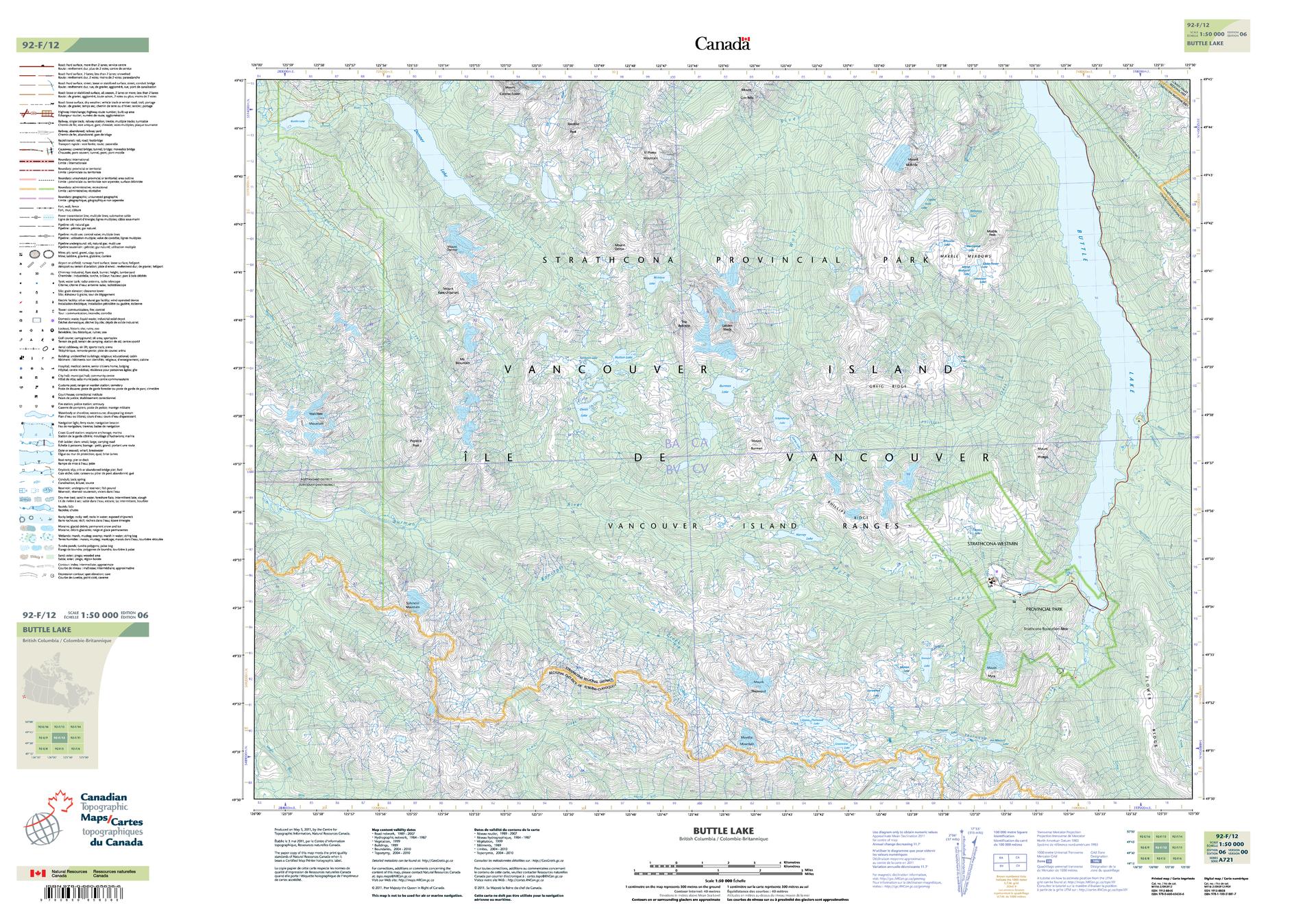 Canadian topographic map of Buttle Lake, British Columbia. NTS sheet 092F12 Edition 6.