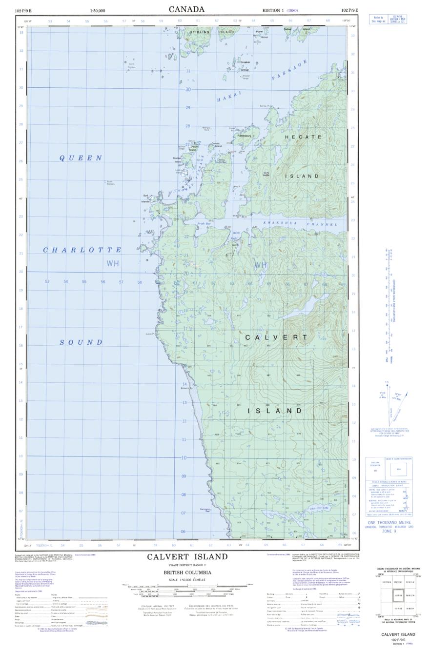 Canadian topographic map of Calvert Island, British Columbia. NTS sheet 102P09 E Edition 1.