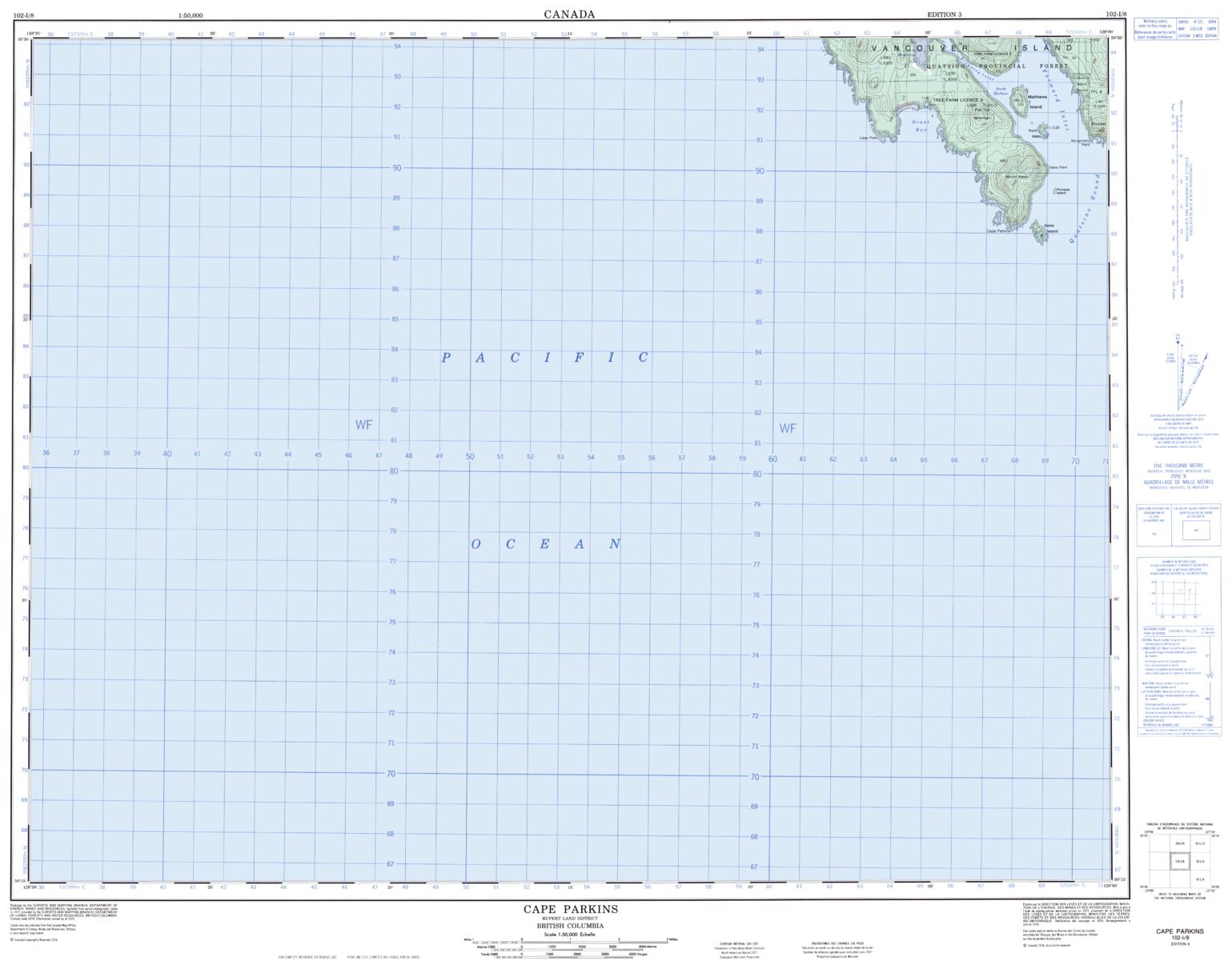 Canadian topographic map of Cape Parkings, British Columbia. NTS sheet 102I08 Edition 3.